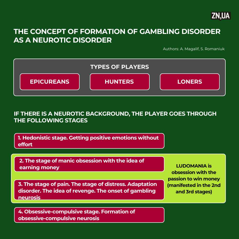 — The second factor is Psychological. A person, for various reasons, may not cope with the challenges of his life and experience severe stress. Or a person may be in a long-term situation of distress, without getting out of a state of tension. It is clear that such a person wants to escape from such a traumatic reality, from problems, and now also from a full-scale military invasion, to find some kind of outlet where he can at least briefly get distracted. In such stressful situations, people can often get into various chemical dependencies. In gambling addiction, escaping from reality is more relevant to those who play slots, since slots contain technology that puts some people into a hypnotic state where there is no pain, no emotions and experiences. Researchers in the West call this state a "dark flow". Those who play bets, poker and trading do not escape from reality. On the contrary, they want to change it.