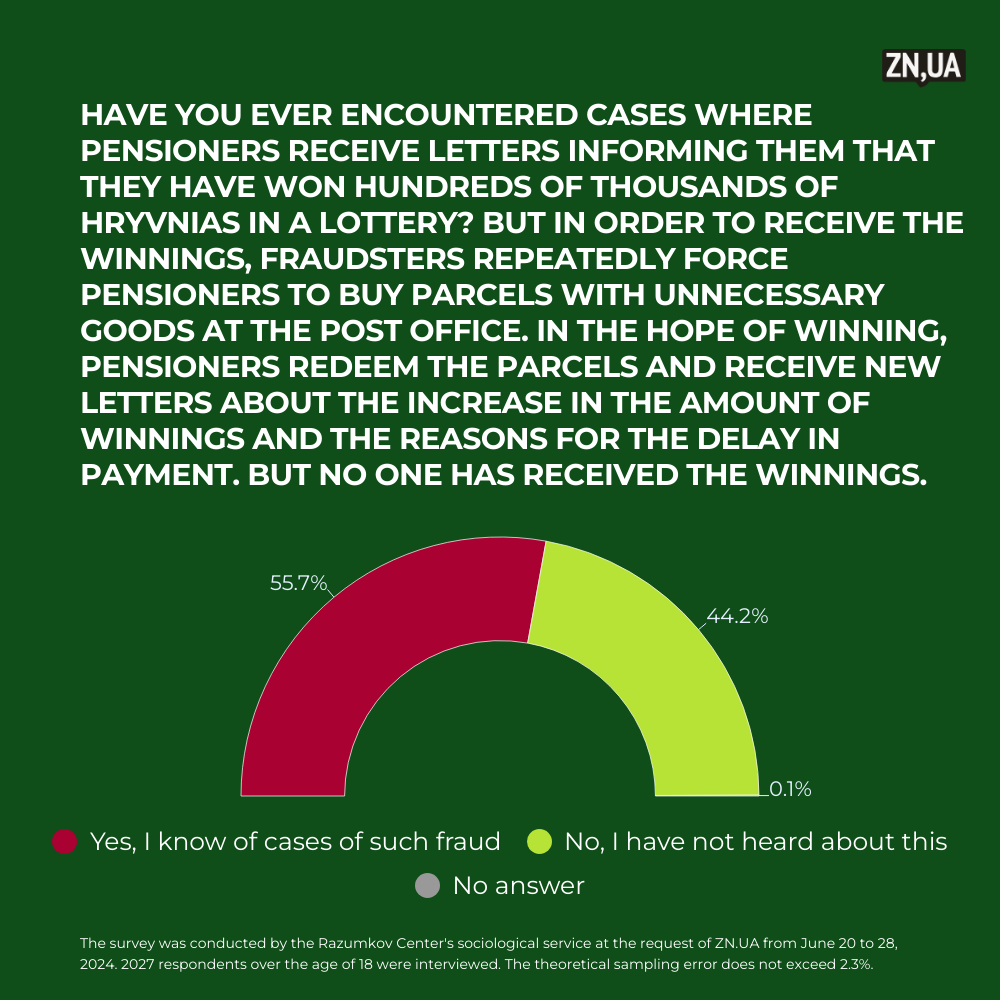 — By the way, about hope. ZN.UA asked Ukrainians: "Have you encountered cases when pensioners receive letters with notifications of their lottery wins worth hundreds of thousands of hryvnias? But in order to receive the winnings, scammers repeatedly force pensioners to buy parcels with unnecessary goods at the post office. With the hope of receiving winnings, pensioners redeem parcels and receive new letters about the increase in the winning amount and the reason for the delay in payment of money. But no one has ever received the winnings. How would you comment on this? Who is more excited about this - the scammers or the pensioners?