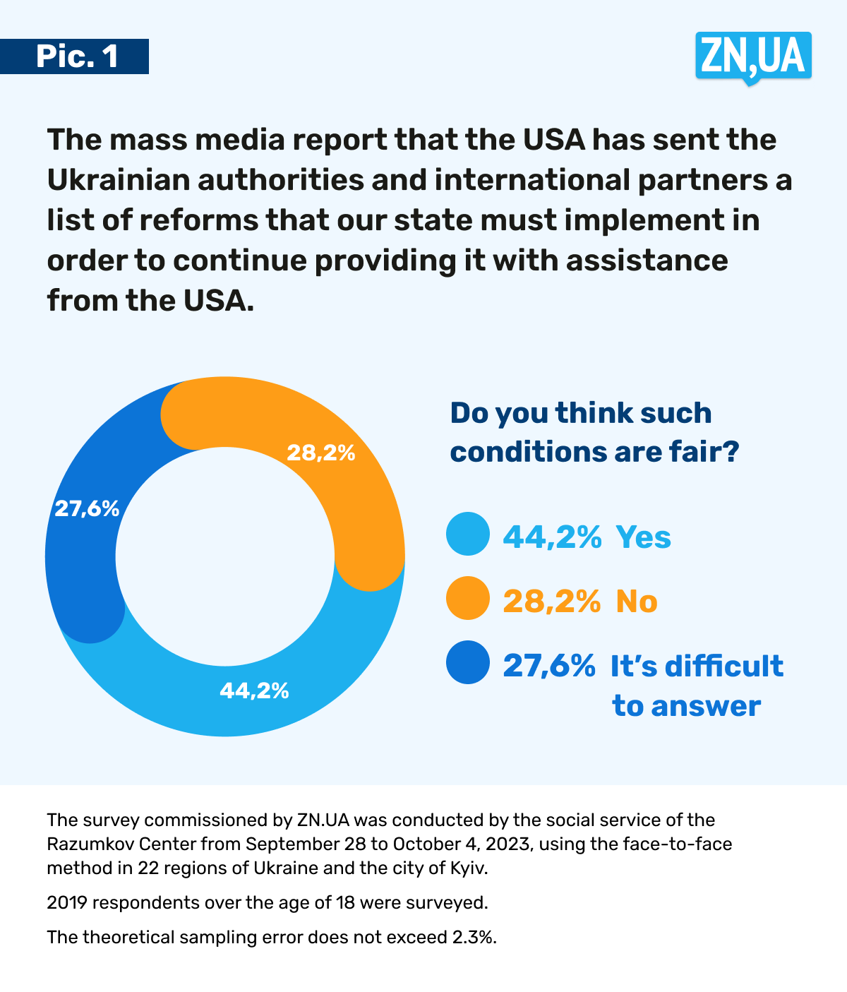 We asked the respondents whether they think it is fair that Ukraine should implement reforms in order to continue providing it with aid from the United States. 44% answered positively, 28.2% answered “no” (the rest chose the option “It’s difficult to answer” - see Figure 1).