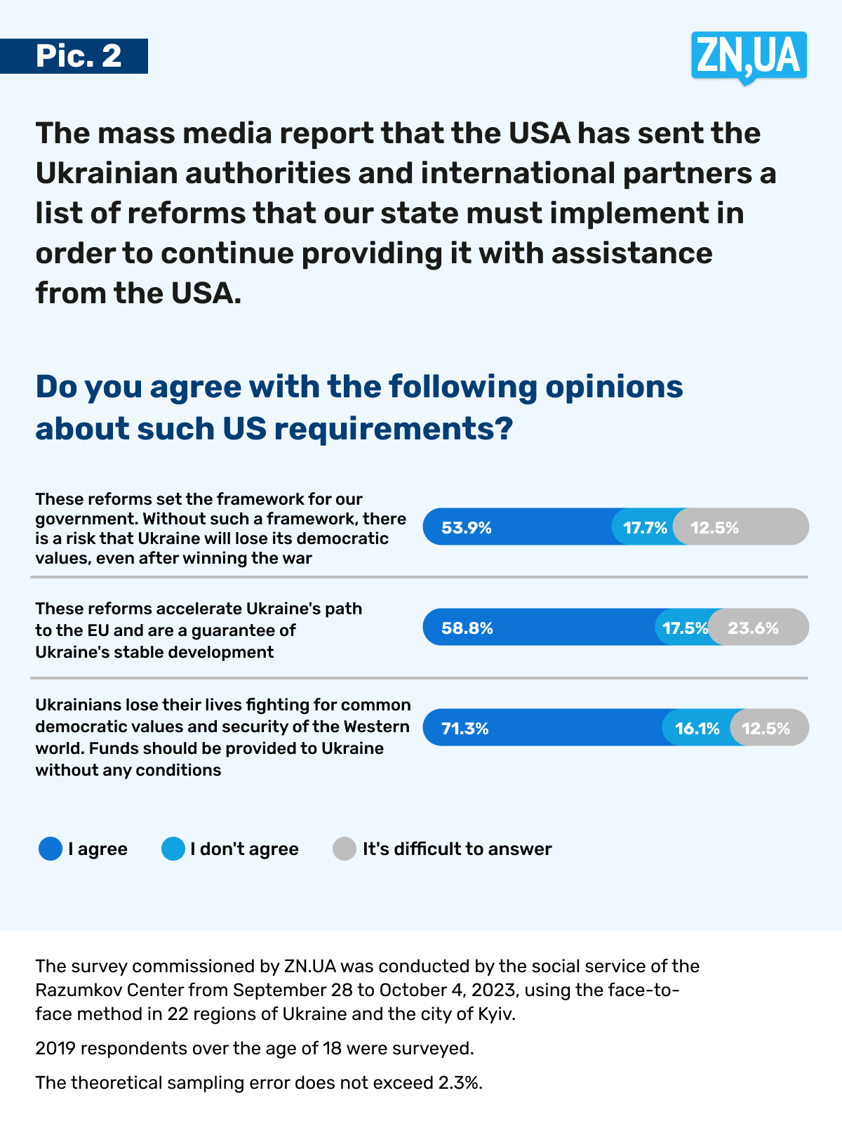 The majority of Ukrainians (71.3%) agree that money should be provided without any conditions, because we lose our lives fighting for common democratic values and security of the Western world (16.1% disagree with this, and for 12.5 % of respondents it is difficult to answer). Meanwhile, 58.8% are convinced that the reforms proposed by the USA will speed up Ukraine’s path to the EU and are a guarantee of stable development of our country (17.5% disagree, 23.6% find it difficult to answer). 53.9% agree that the reforms proposed by the US establish a framework for our government, without which there is a risk that Ukraine will lose its democratic values, even after winning the war (17.7% disagree with this, 28.4% find it difficult to answer). That is, in contrast to Bankova, Ukrainians do not accept proposals for change hostilely, although they believe that tying the allocation of funds to the progress of reforms is a dubious decision.