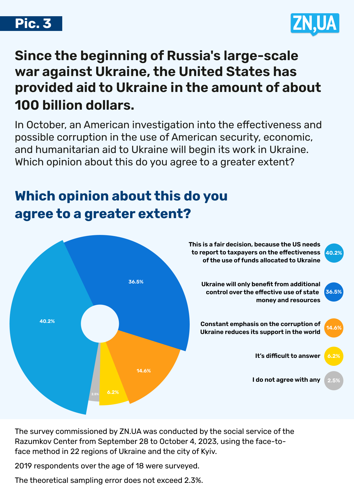 Respondents could support only one of the proposed points. More than 40% chose the option — “This is a fair decision, because the US needs to report to taxpayers on the effectiveness of the use of funds allocated to Ukraine.” The point that “Ukraine will only benefit from additional control over the effective use of state money and resources” was supported by 36.5% of respondents. Only 14.6% chose the option “Constant emphasis on the corruption of Ukraine reduces its support in the world.” Even fewer (2.5% of respondents) people did not agree with any of the points. There are more people who simply understand the US position than those who also support it, but definitely the majority will not resist the changes.