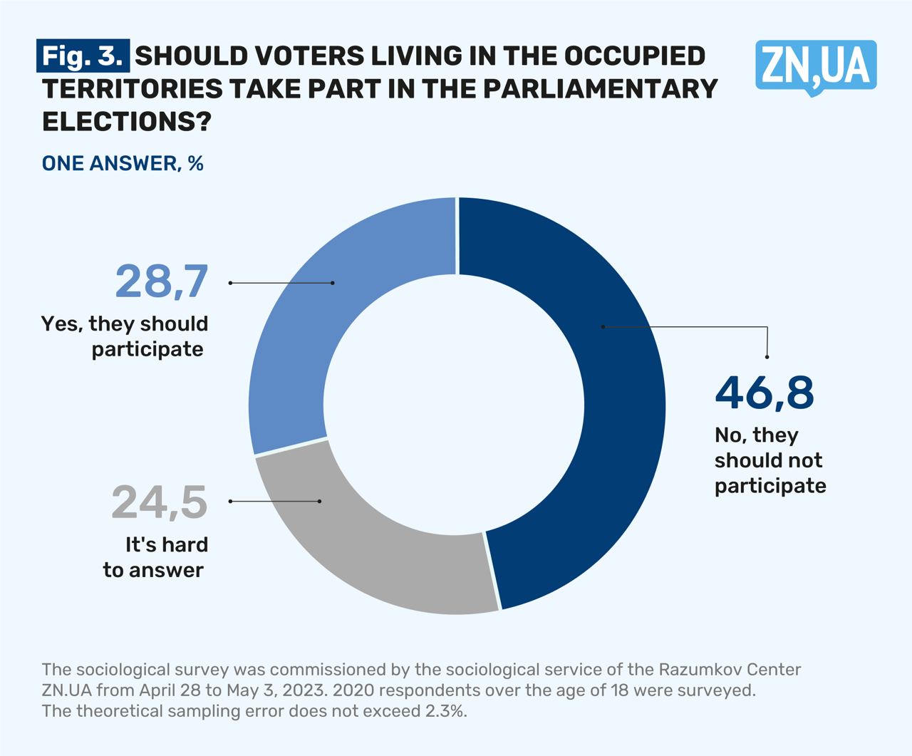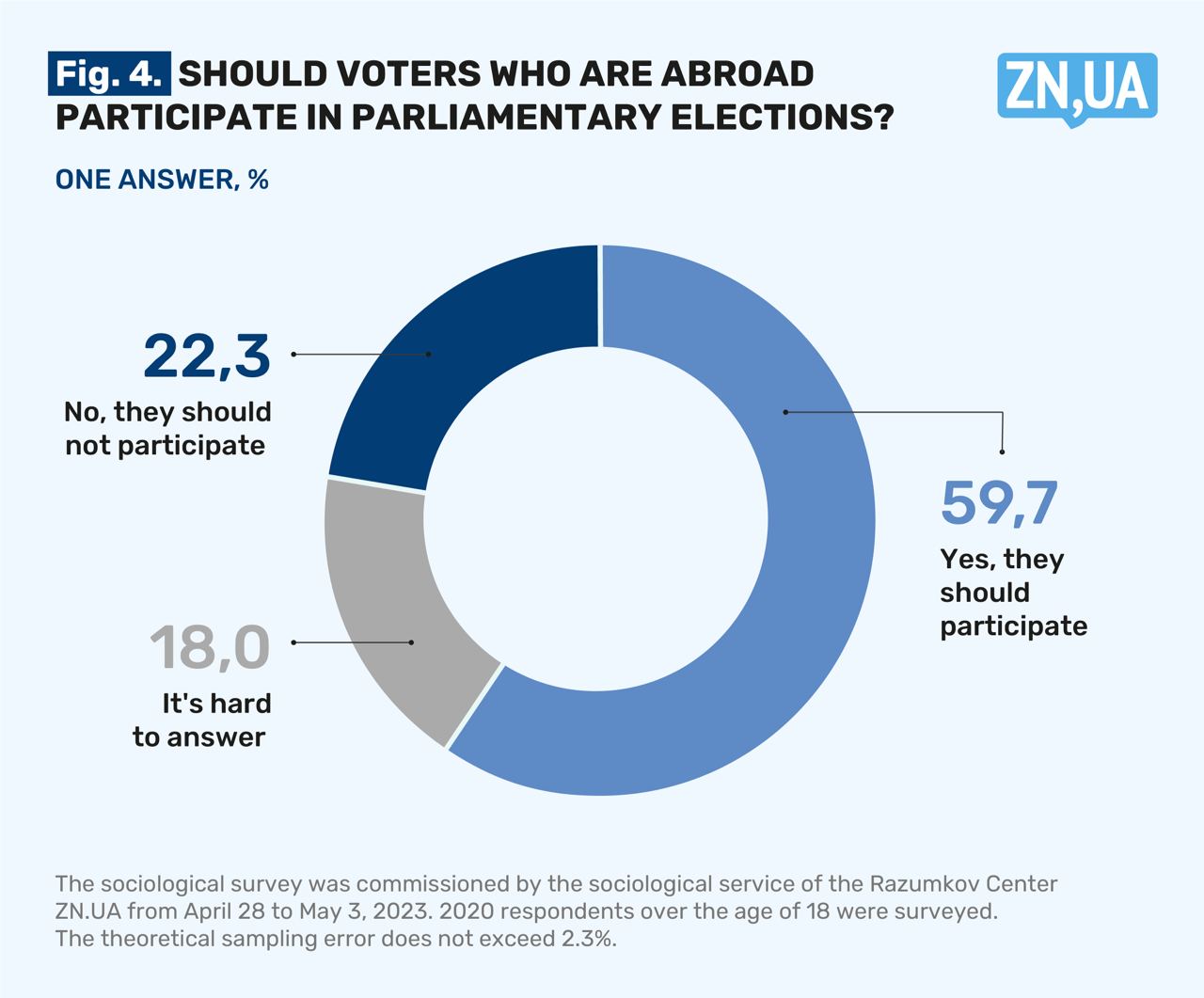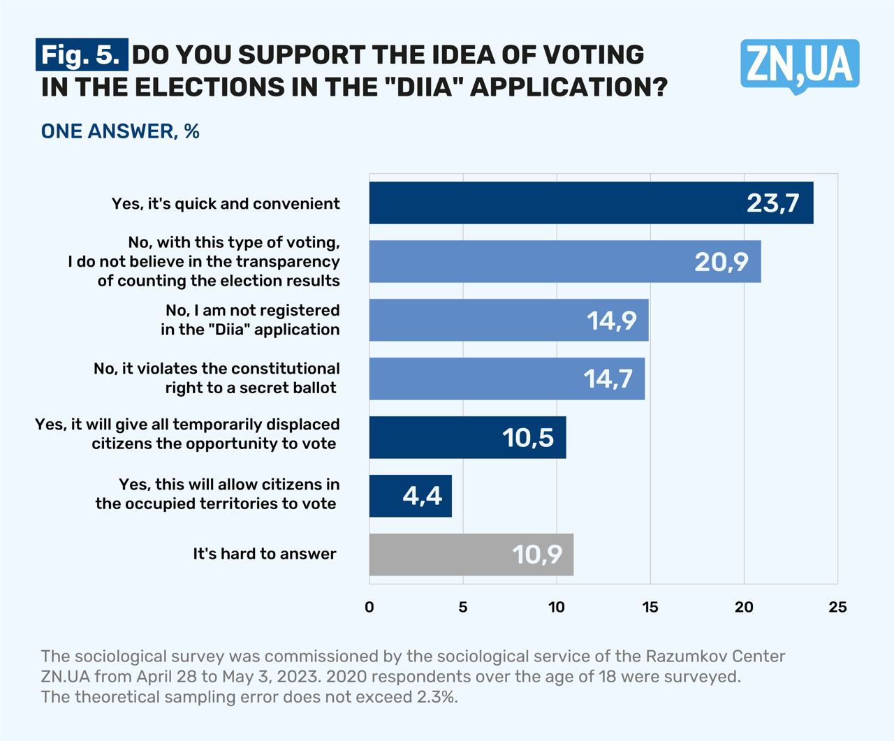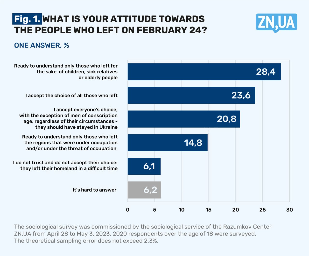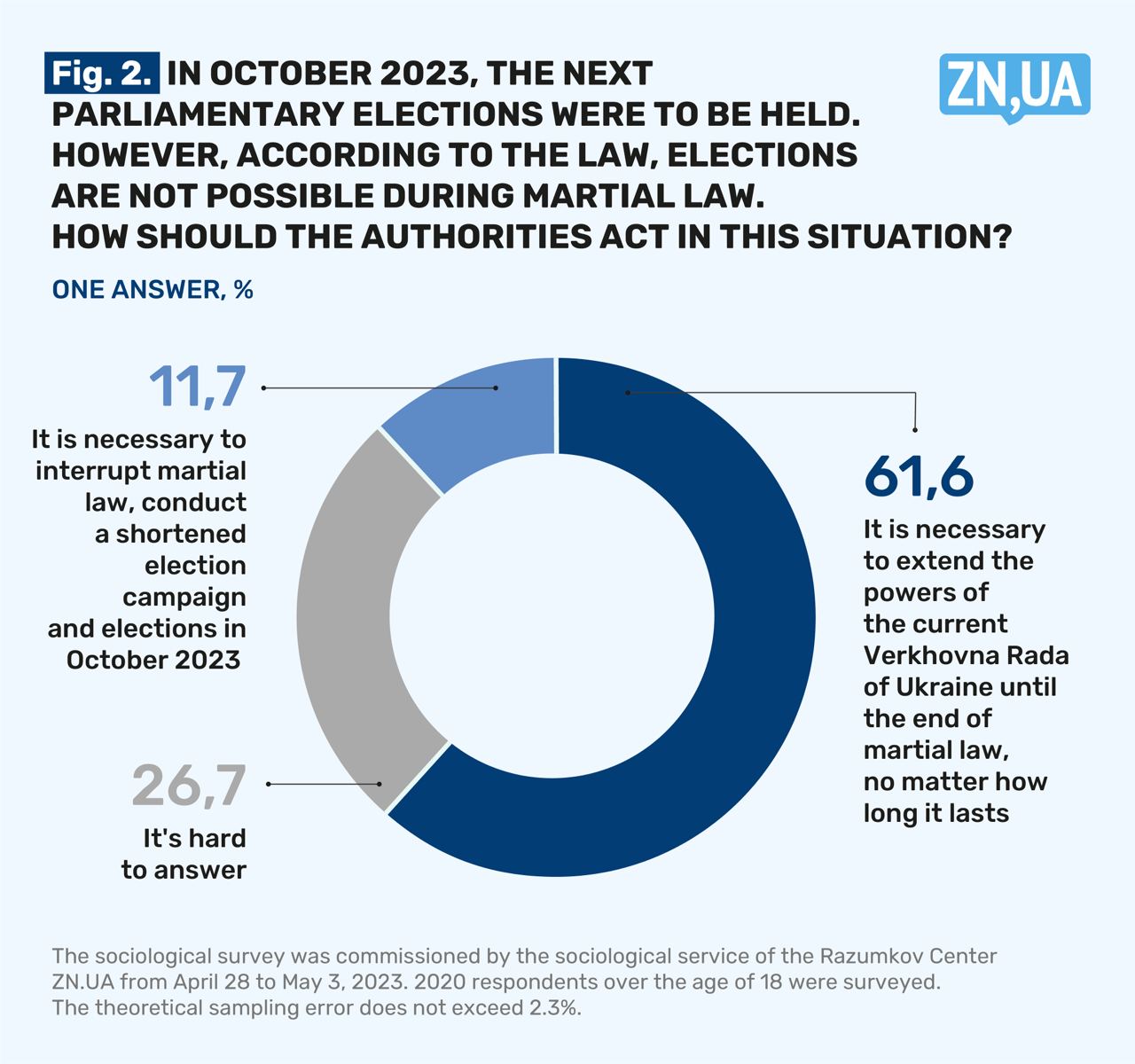 The survey was conducted by the Razumkov Center on the order of ZN.UA from April 28 to May 3, 2023, using the face-to-face method in 22 regions of Ukraine and the city of Kyiv. 2020 respondents over the age of 18 were surveyed. The theoretical sampling error is no more than 2.3%.