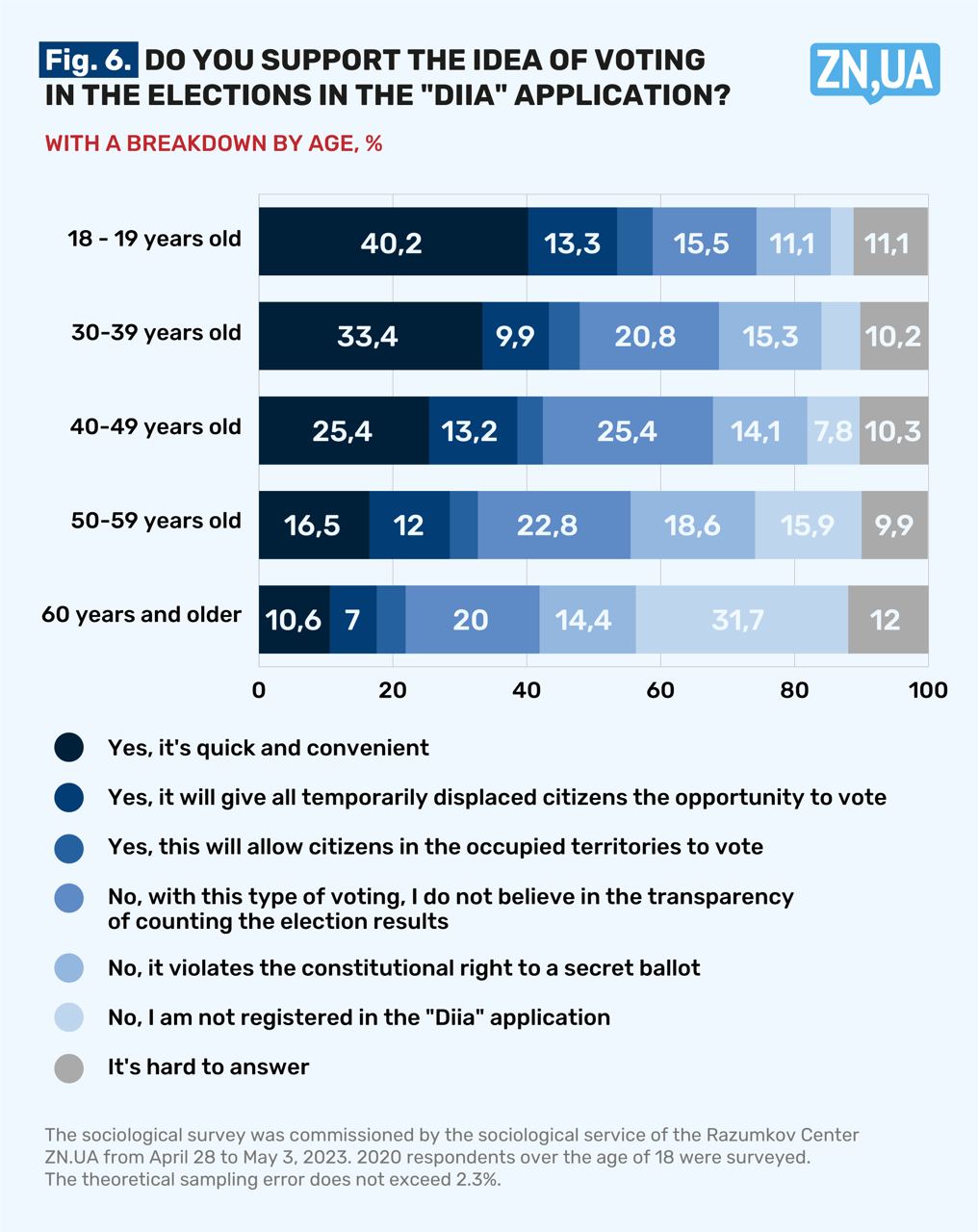 The topic of voting through the platform is widely discussed only in narrow circles. People who, in fact, faced such a question for the first time, did not have time to think. Therefore, despite all the love for the service and paying tribute to the head of the Ministry of Digital Transformation Fedorov and his team, who did a lot of useful things during the war, only 23.7% of the respondents are ready to vote in the application called "Diia". It is not surprising that the vast majority of them (73.6%) are young people aged 18 to 39. Also, 10.5% of respondents are supporters of electronic voting, because "all displaced persons can vote" this way. Apart from that, 4.4% of the people surveyed, reflecting on this topic, mentioned the rights of residents of the occupied territories, to whom the "Diia" application can also give an opportunity to express their opinion.