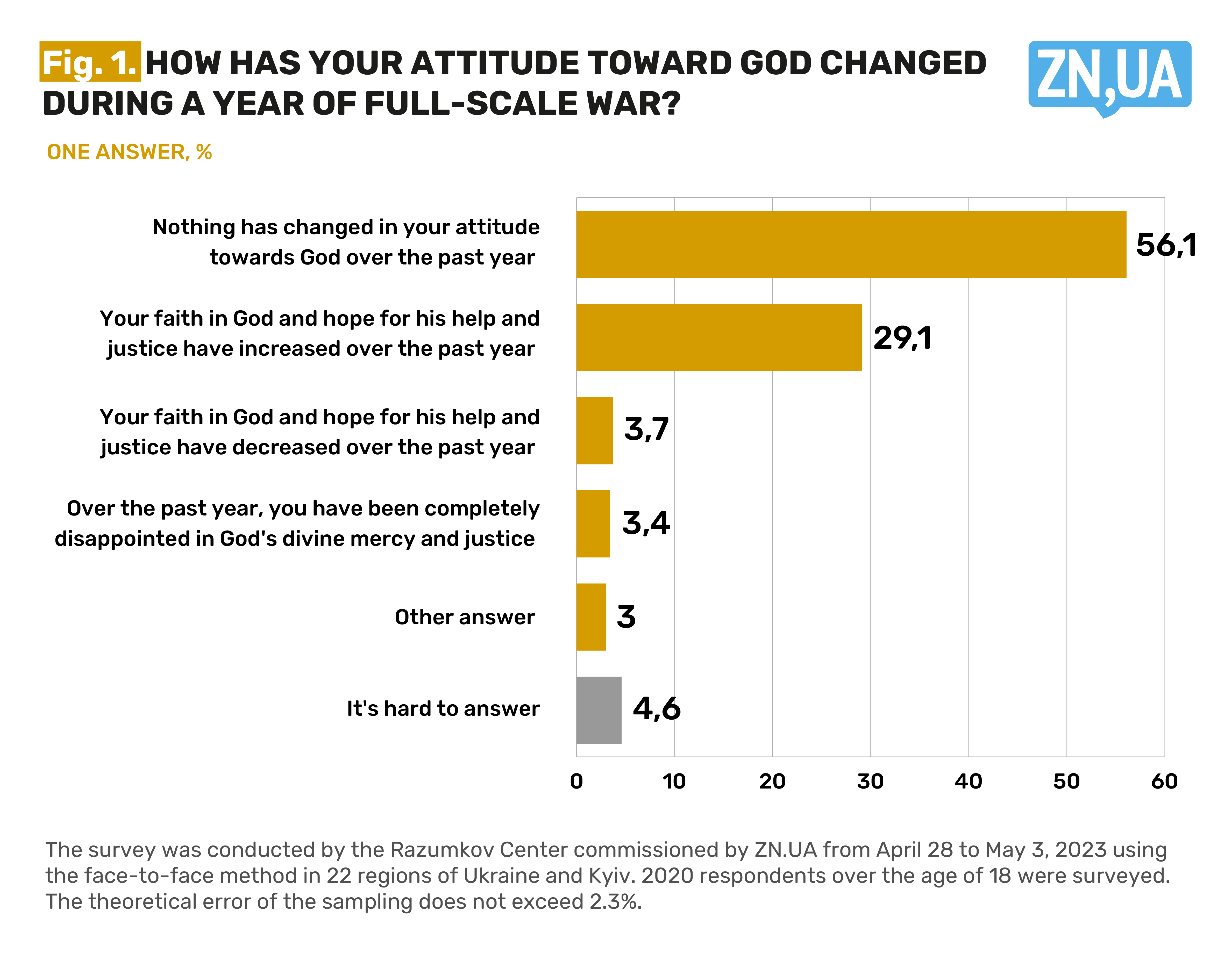 According to a sociological survey conducted by the Razumkov Center commissioned by ZN.UA in April-May 2023, 29% of Ukrainians have increased their faith in God during the full-scale war. And only 7%, on the contrary, lost their faith to some extent (see Fig. 1).