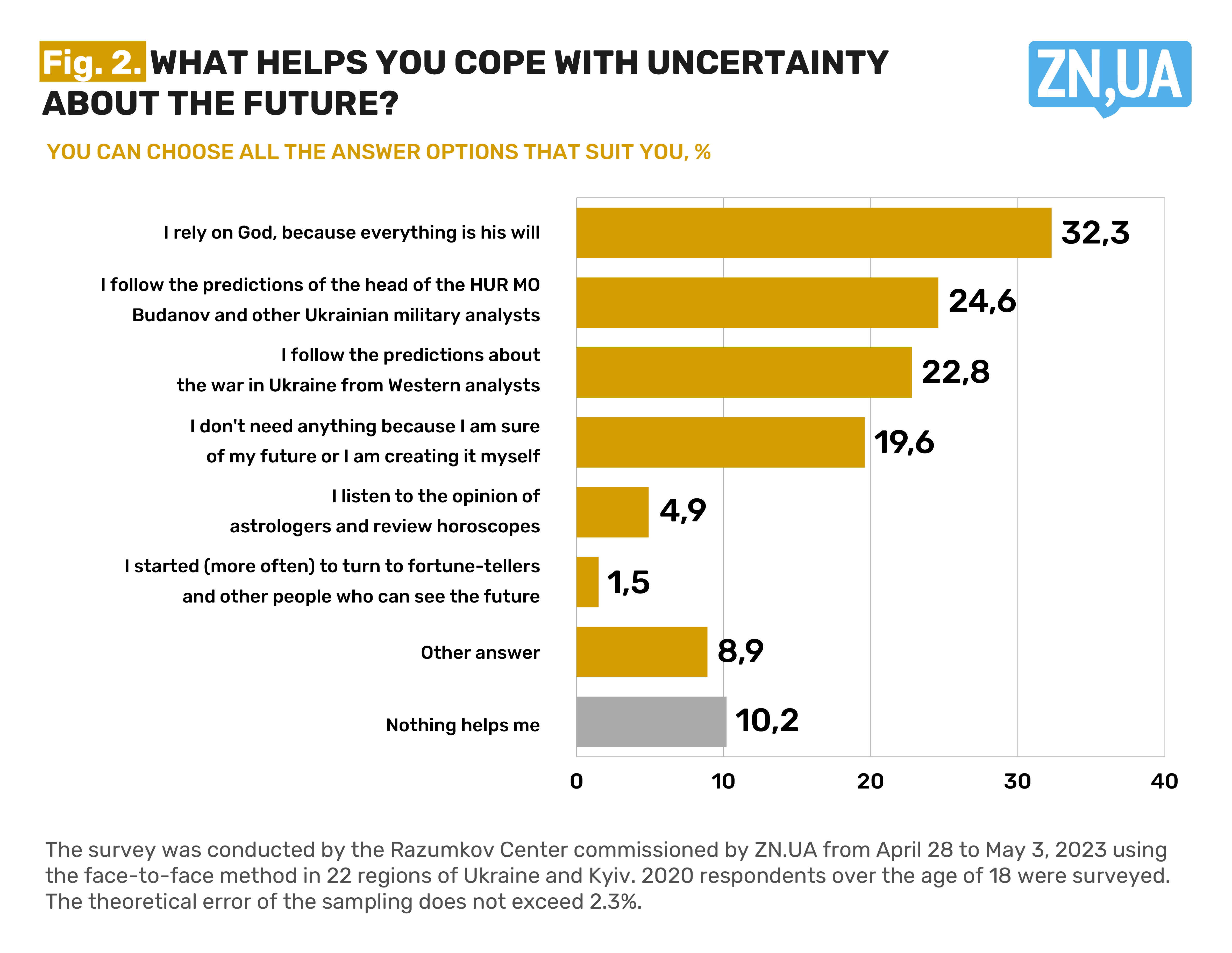 When asked what helps them cope with uncertainty about the future, the largest number of respondents, namely 32.3%, answered that they "rely on God, because everything is His will." Thus, the hope for salvation with the help of faith in God has outstripped in this peculiar rating the predictions and vision of the development of the situation in the future by Kyrylo Budanov (24.6% of Ukrainians cope with uncertainty, following the predictions of the head of the Main Directorate of Intelligence of the Ministry of Defense of Ukraine (HUR MO), and Western analysts. Thus, according to the survey (22.8% of respondents – link their hopes with the predictions of these analysts regarding the development of the situation in the future) (see Fig. 2).