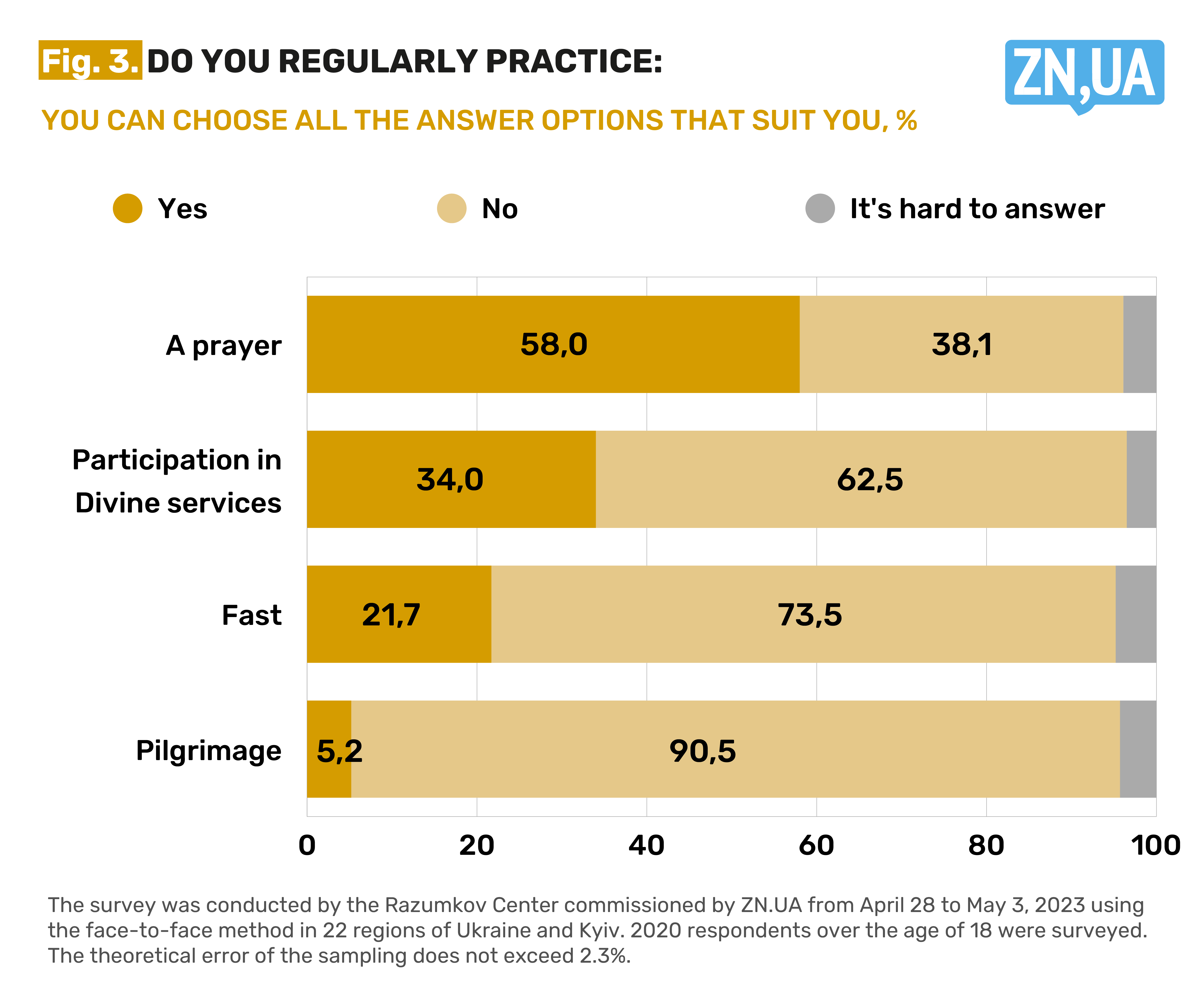 The most popular religious practice among Ukrainians is prayer (see Figure 3). Moreover, this prayer should most often be of a “private nature”: 58% of the respondents pray regularly (38% do not practice prayer). It is also worth noting that, according to the survey, prayerful communion in church services is practiced at least occasionally by only 34% of the people surveyed (62% of Ukrainians do not practice). During a full-scale war, Ukrainians began to pray noticeably more often. Thus, according to a study conducted by Kyiv International Institute of Sociology in 2016, 44% of Ukrainians prayed. And according to a survey by Social Monitoring (2020), 38% of Ukrainians practiced prayer regularly (several times a week). Sociologists recorded a decrease in prayer activity, including during the hybrid war of 2014-2022. Despite this, a full-scale war has partly restored the popularity of this most accessible and most intimate of religious practices.