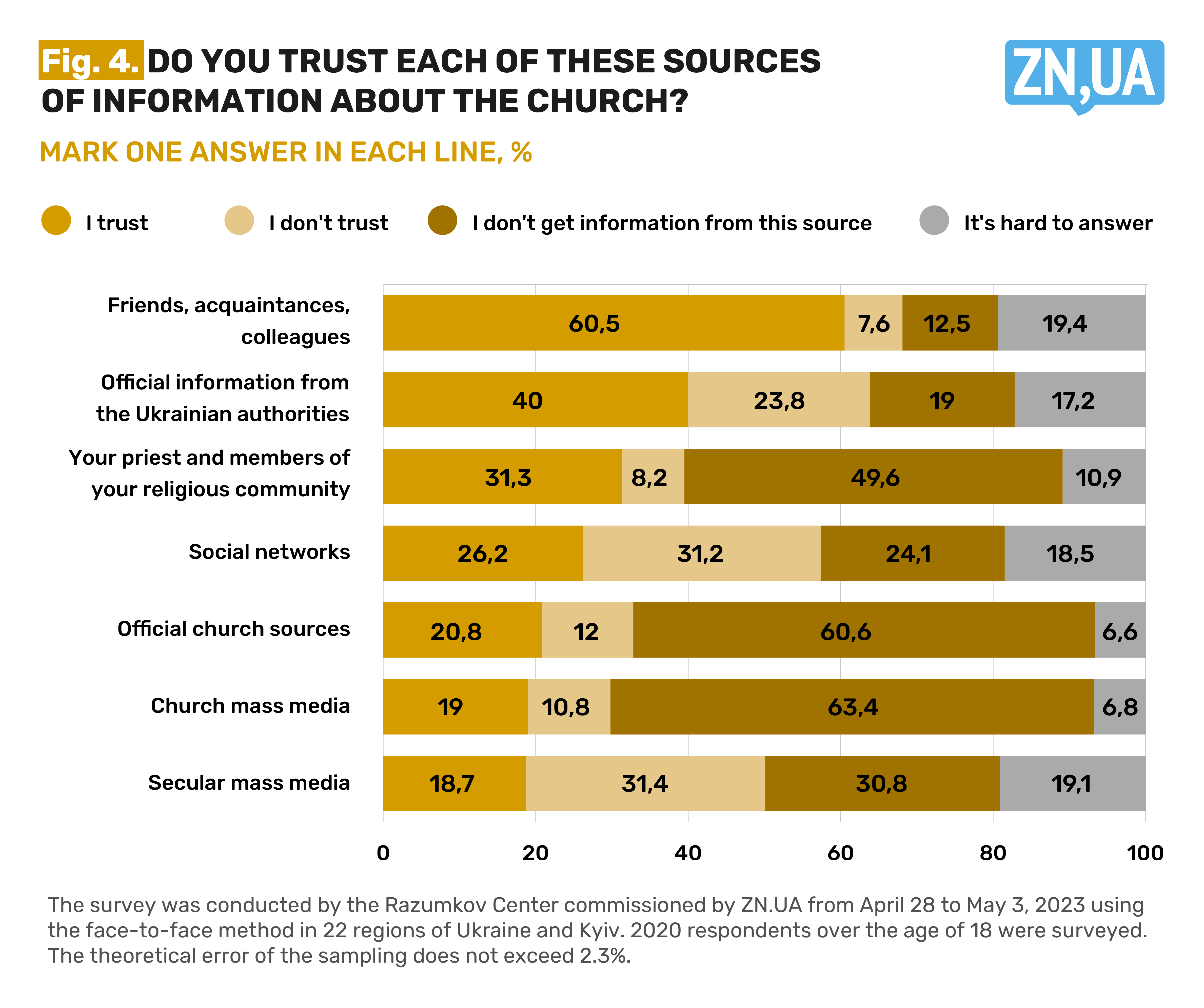 Another curious observation about the intimate nature of Ukrainian religiosity: our beliefs in the church sphere are formed mainly under the influence of oral art. We receive information about the church directly from each other: 60.5% of respondents trust information about the church received from friends and acquaintances, only 7% of Ukrainians do not trust such information. For comparison: 40% of people surveyed trust what the authorities say about the church, 18.7% of respondents trust the secular media (31% of people do not trust what the media say about the church) (see Fig. 4).