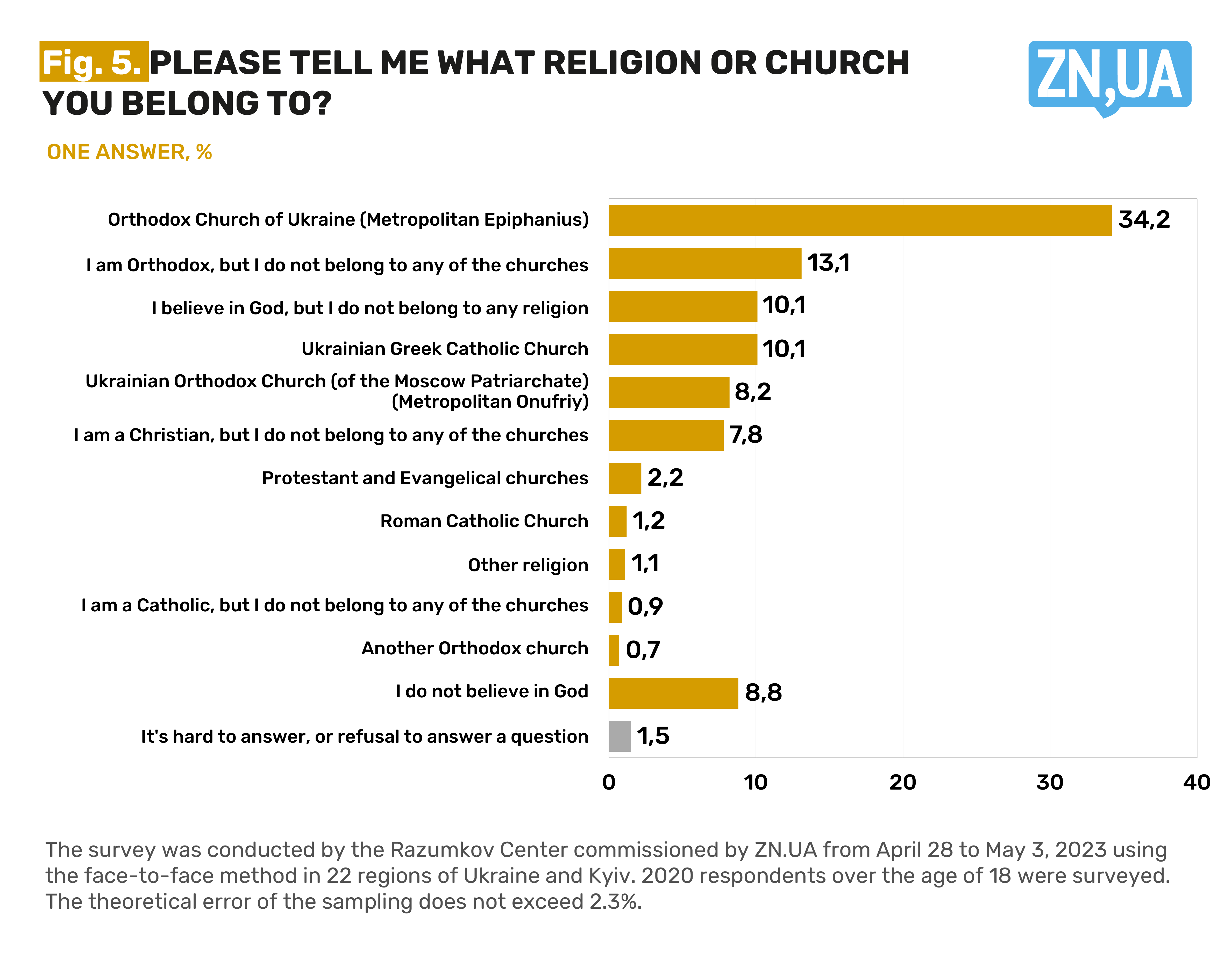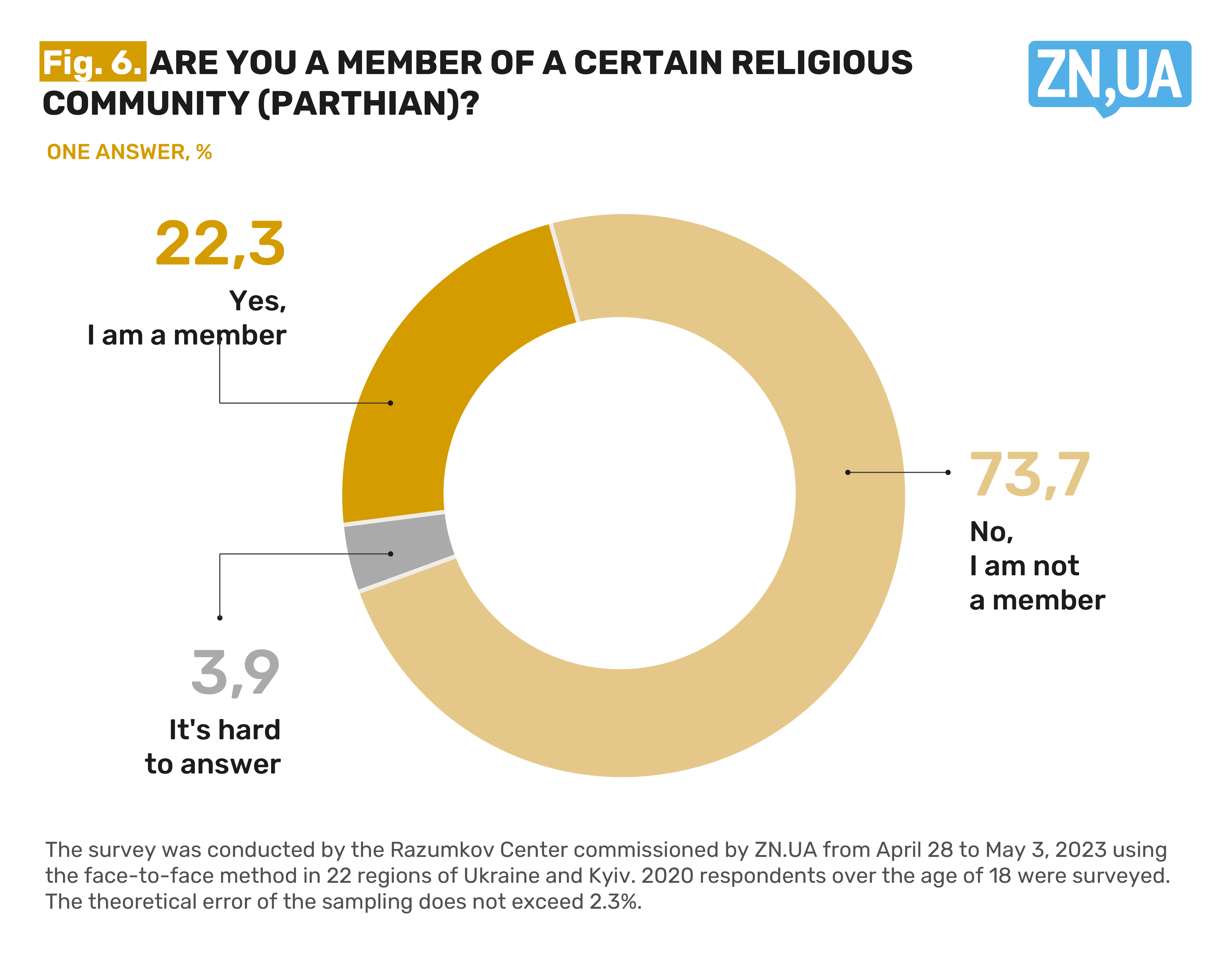 Whatever the Ukrainians' relationship with God, the ZN.UA study shows that a large percentage of them have nothing to do with church life. According to the survey results, it is reported that 73% of Ukrainians do not associate themselves with any religious community or parish (22.3% of respondents declare their belonging to a religious community) (see Fig. 6).