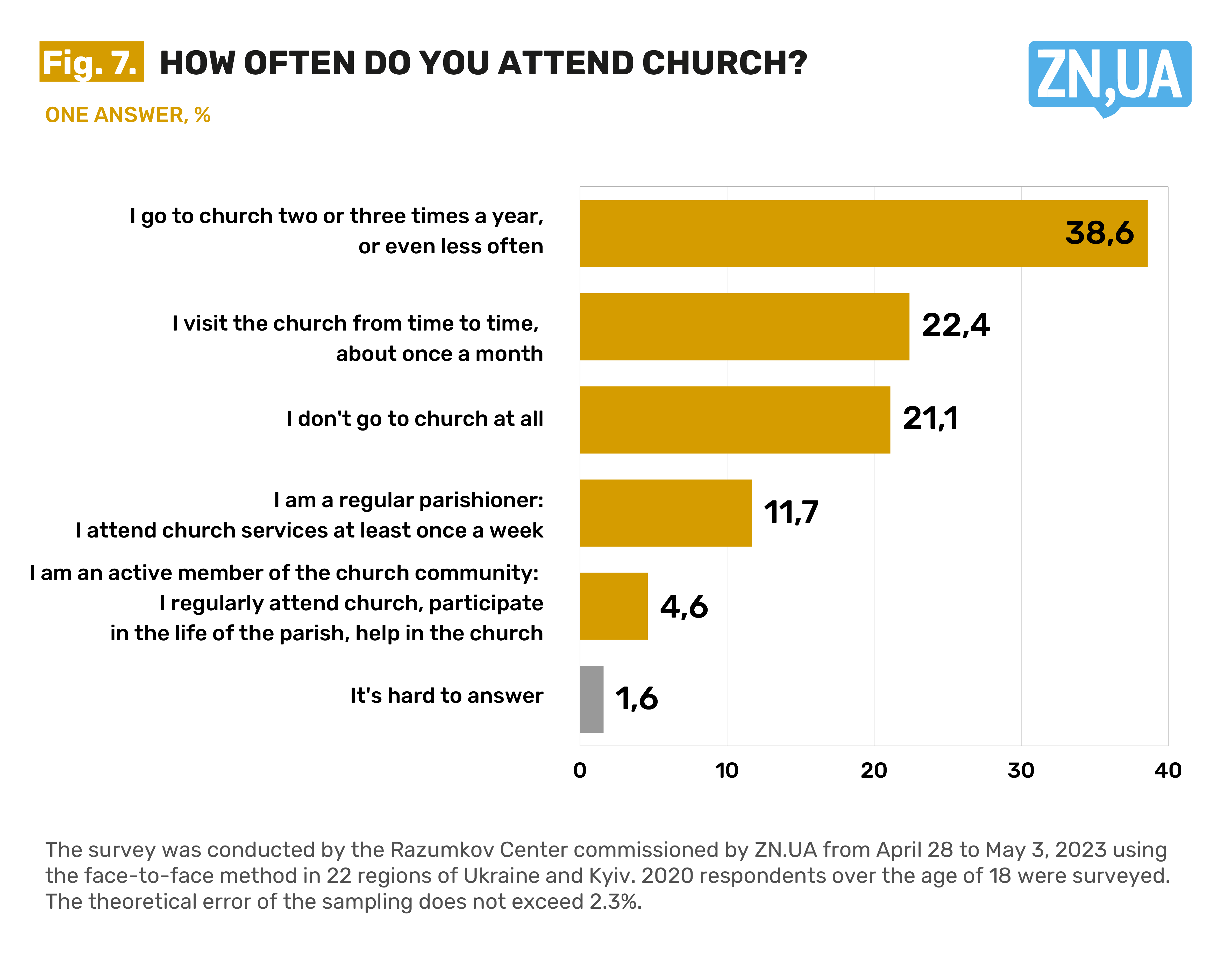 Thus, for the churches, the situation is even a little worse than one might think: according to the current survey, 62% of Ukrainians do not participate in church services. For comparison: in 2021, during a survey by the Razumkov Center to the question: “Do you attend church services?” 51% of respondents answered negatively. The 11% difference is an indicator of the losses that the churches suffered in less than two years of the active phase of the full-scale war. In addition, 21.1% of those surveyed said they never go to church at all (see Figure 7). The decrease in people who actively take part in church life and simply attend church services can be explained by many reasons, including objective ones. But for many of us, the determining factor is the fact that ritualized church practice seems anachronistic against the backdrop of an unsafe and stressful wartime, during which people spend more time not performing church rites, but evacuating to the basement during air raids.
