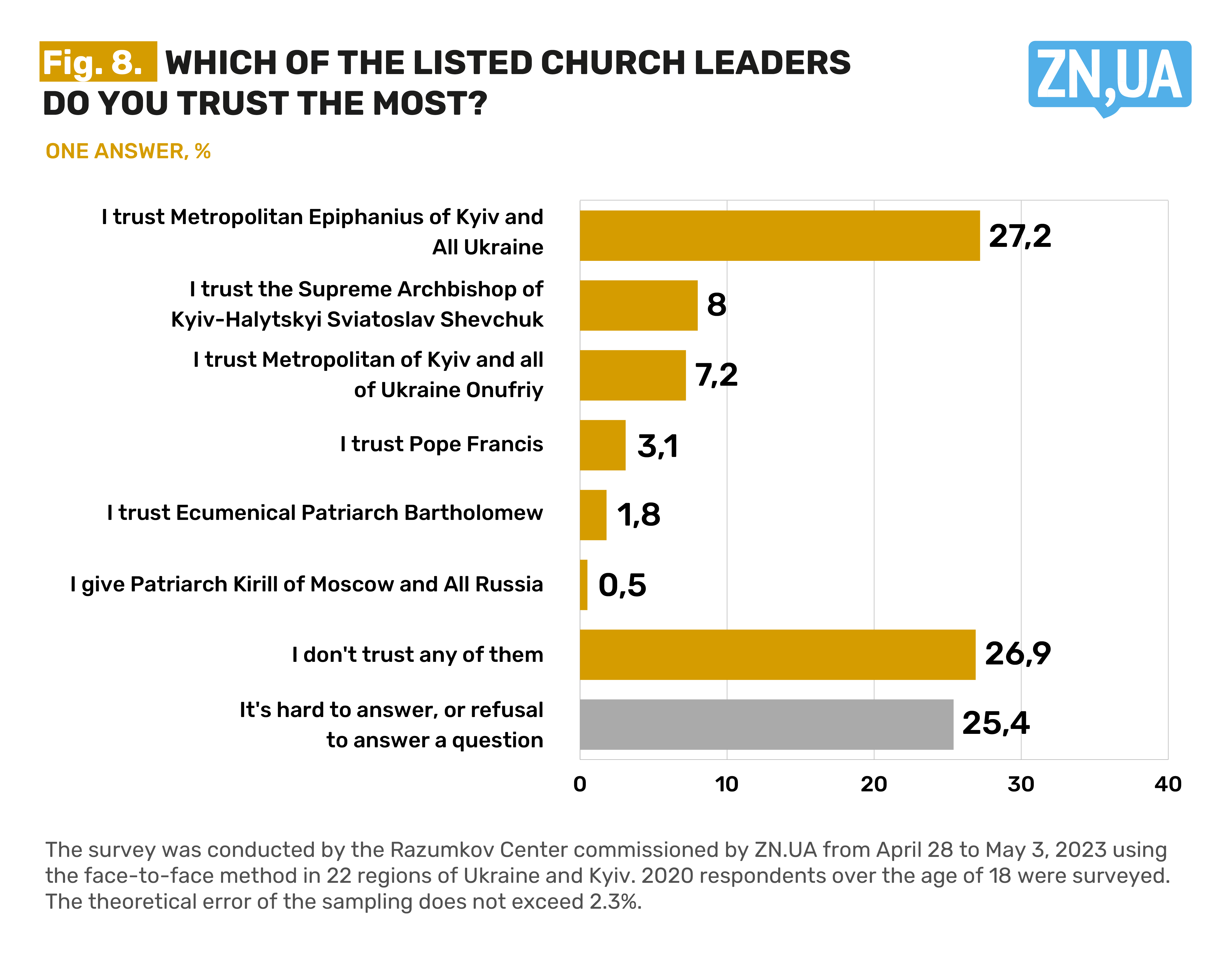 This opinion poll also recorded the loss of the status of "unconditional authority" by the church. If two or three years ago, most Ukrainians could choose among church leaders someone who is trustworthy, then in the course of the current survey it turned out that 52% of respondents either do not trust any of the heads of churches (27%), or cannot / refuse to answer this question (25%) (see Fig. 8). Trust in our difficult times is not bestowed just like that – it requires real reasons, expressed by concrete deeds, and not just based on the fact of belonging to some, even sacred, institution.