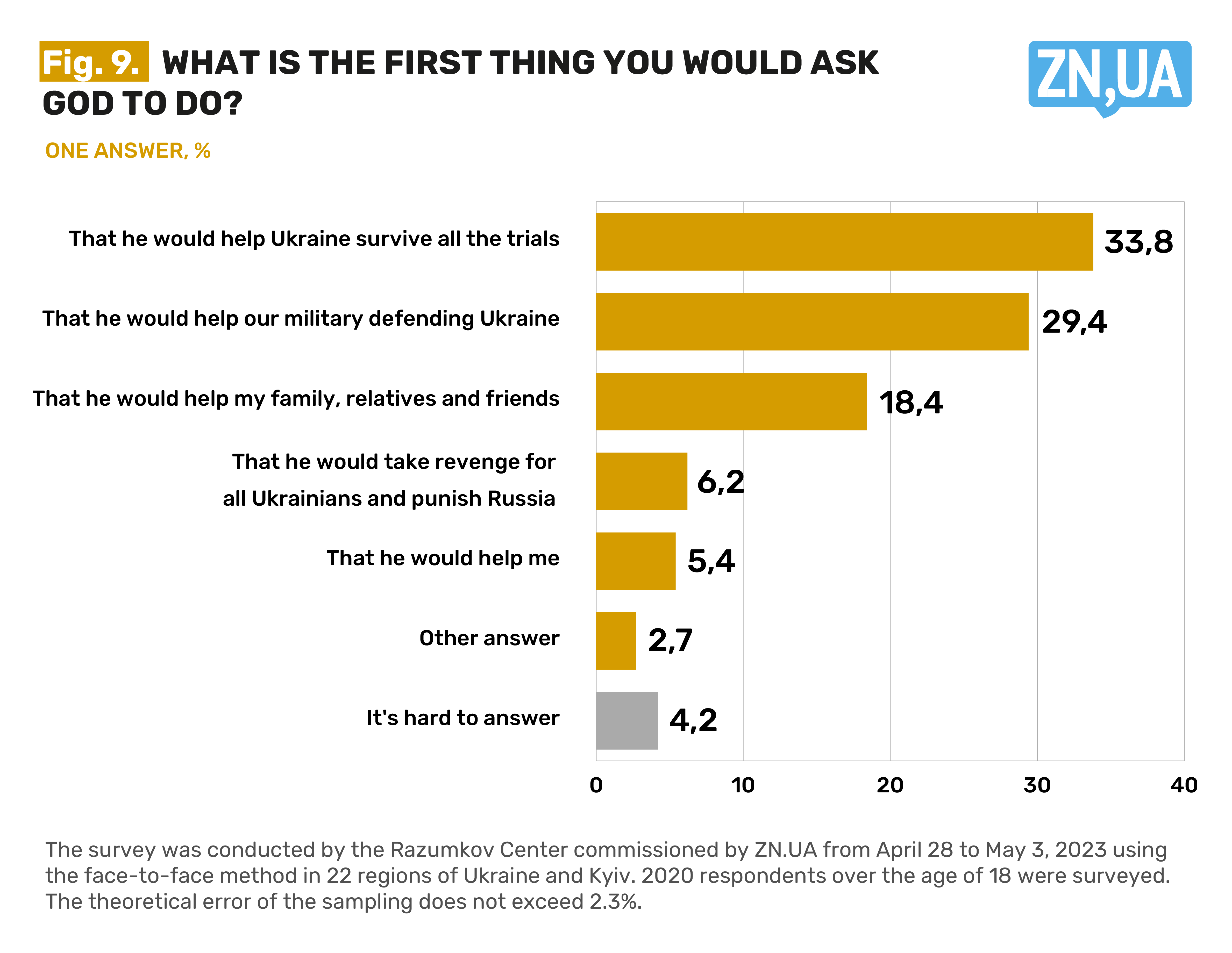 During the war, we are very keenly experiencing the idea of the unity of our nation and are ready to sacrifice many things for its sake. According to the survey, only 5.4% of Ukrainians ask God to help them personally. It is worth noting that 18.4% of respondents ask for help for their closest ones. But mainly our people ask God for help to Ukraine: 29.4% of citizens ask for help to those who defend the country, and almost 34% of respondents ask to help Ukraine survive in a full-scale war. In addition, it is noted that 6.2% of the respondents (mostly young people aged 18–29) ask God to punish Russia and take revenge for us and our country (see Fig. 9).