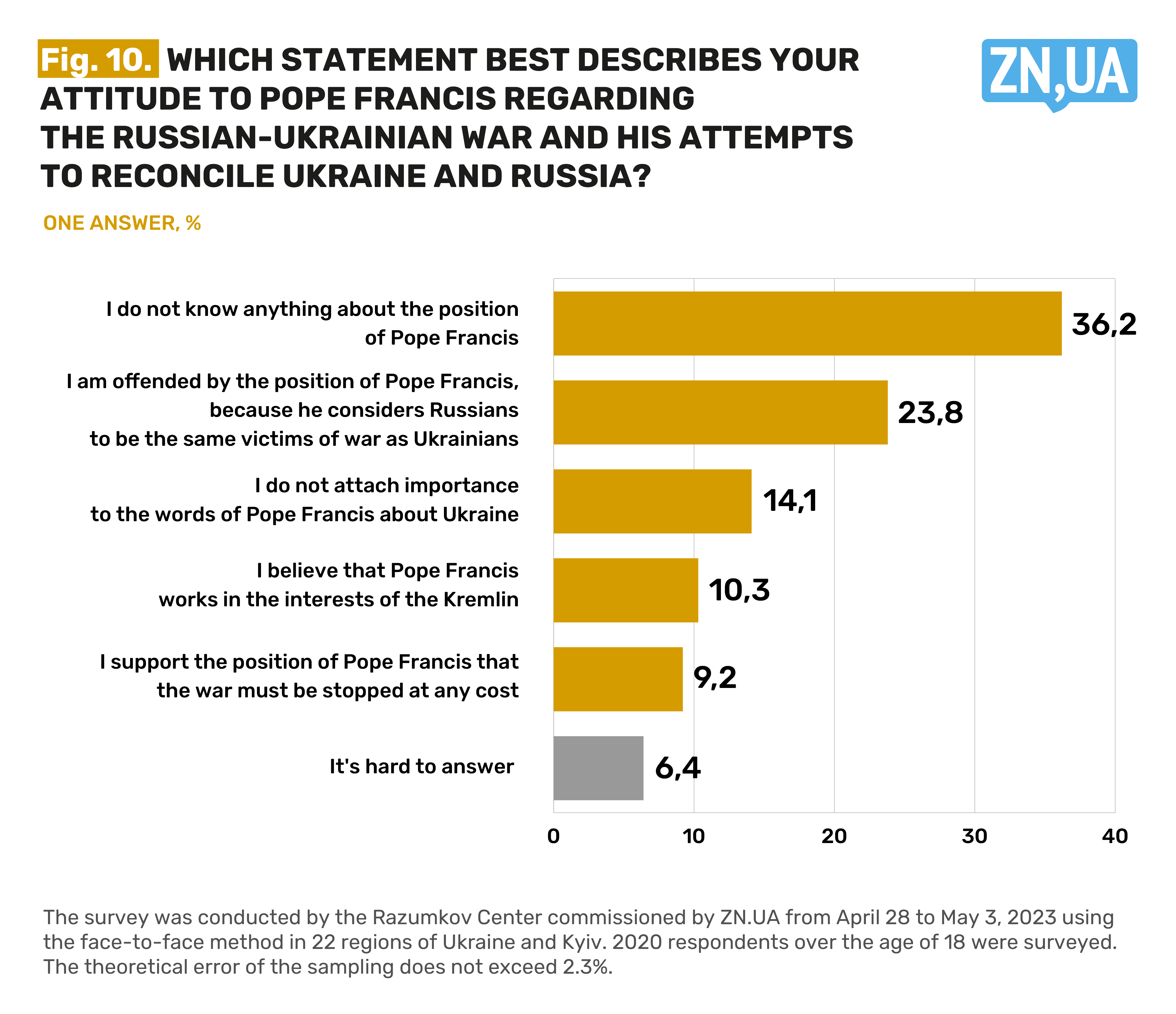 Part of the answer may be the extent to which Ukrainians support Pope Francis's position on the Ukrainian-Russian war. It should be noted that 23.8% of Ukrainians are offended by the Pope for the fact that "he considers Russians to be the same victims of the war as Ukrainians." In addition, 10% of respondents generally believe that Pope Francis works and makes decisions that are in the interests of the Kremlin. Those who fully support his desire to achieve peace as soon as possible and at any cost are the least – 9.2% of respondents. (see fig. 10)