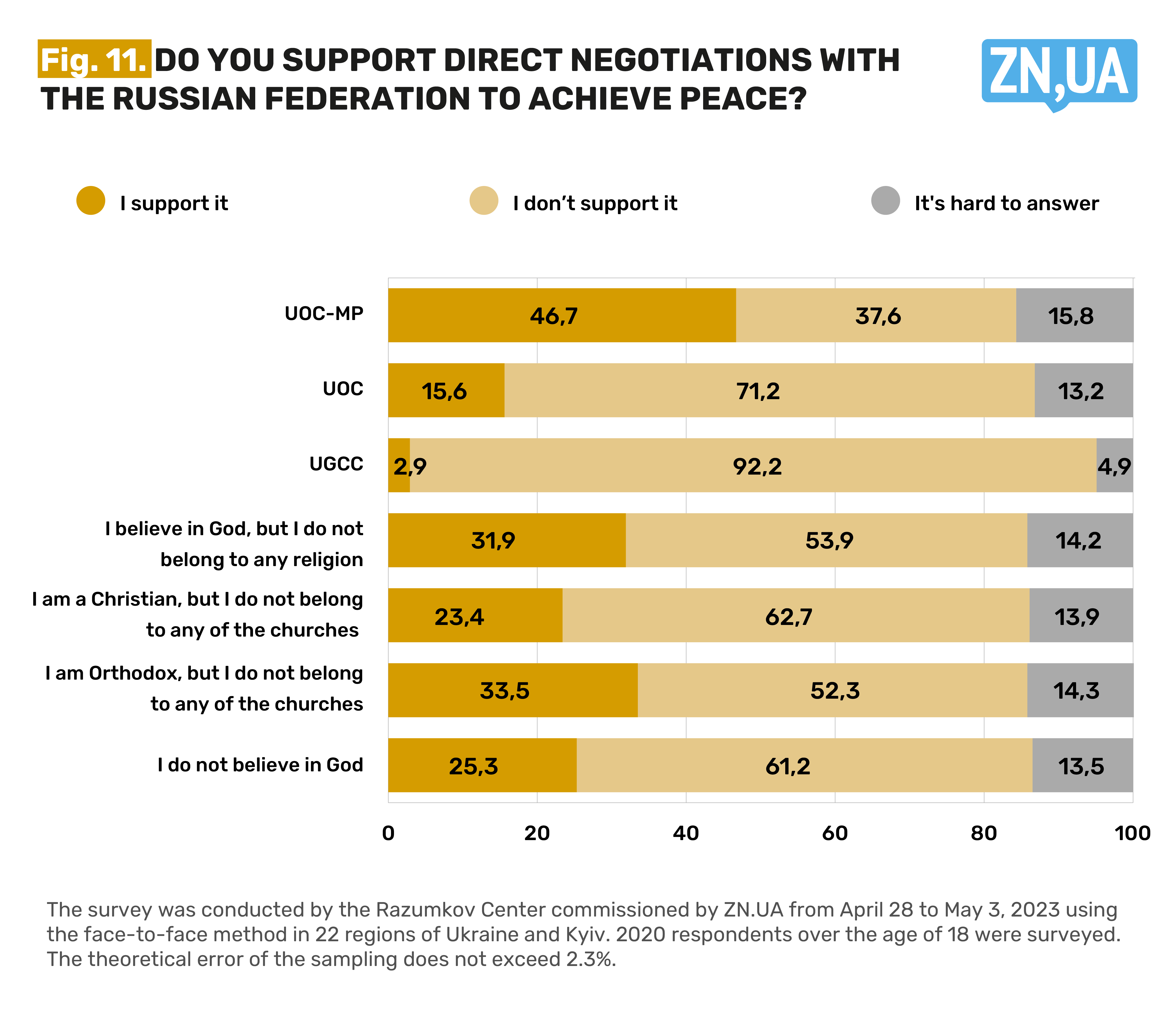 And only 2.9% of Greek Catholics support the idea of their head of the church – Pope Francis – about direct negotiations between Kyiv and Moscow. It is also worth noting that the vast majority of the faithful who belong to the Ukrainian Greek Catholic Church (UGCC) - 92% - are against such negotiations. (see fig.11)