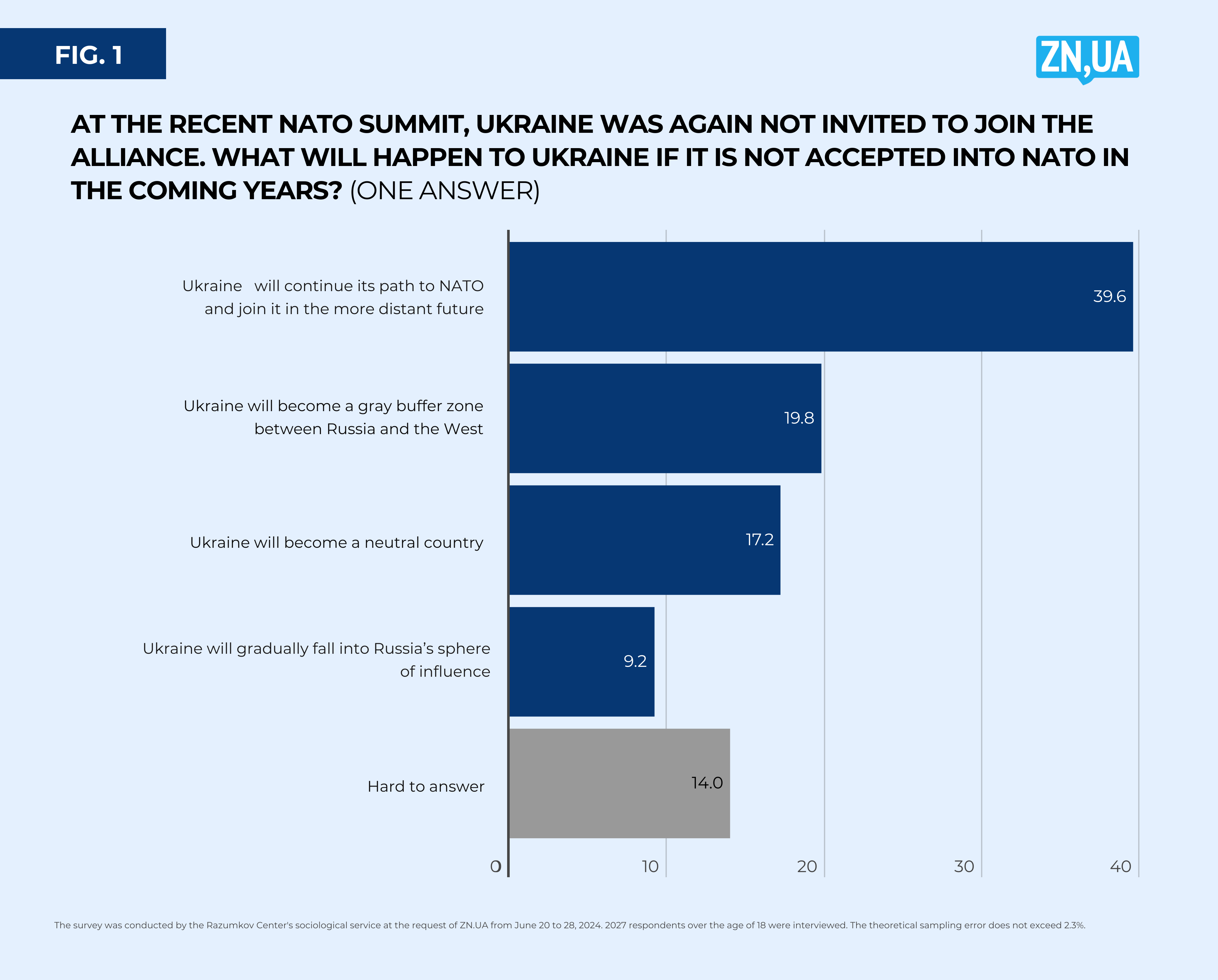 “What will happen to Ukraine if it is not admitted to NATO in the next few years?” we asked Ukrainians within the framework of the sociological survey conducted on behalf of ZN.UA by the Razumkov Centre on June 20–28. 19.8% of respondents believe that in this case the future of Ukraine is a gray buffer zone between Russia and the West (this scenario is more widely held in the center of the country — 21.3% and in the east — 26.5%). Another 17.2% believe that Ukraine will be a neutral country (27.7% in the south of Ukraine think so).
