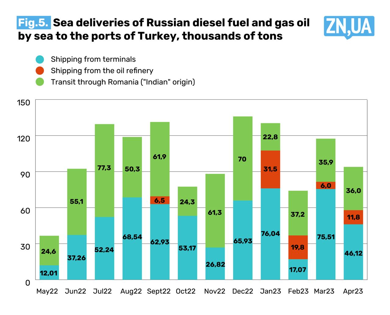 Accumulating huge volumes of diesel fuel from Russia and India, which has almost completely switched to Russian oil, Turkey has become the largest hub in the Black Sea and Mediterranean regions. Moreover, Turkish ports are also able to receive huge 100,000 tankers from India, which Romanian or Bulgarian terminals are not able to do. According to the data of the Institute of Statistics, in the first quarter of 2023, about 550,000 tons of diesel fuel transited through Turkish terminals, most of which went to Ukraine and Romania, from where, again, a large share went to Ukraine (see Fig. 5).