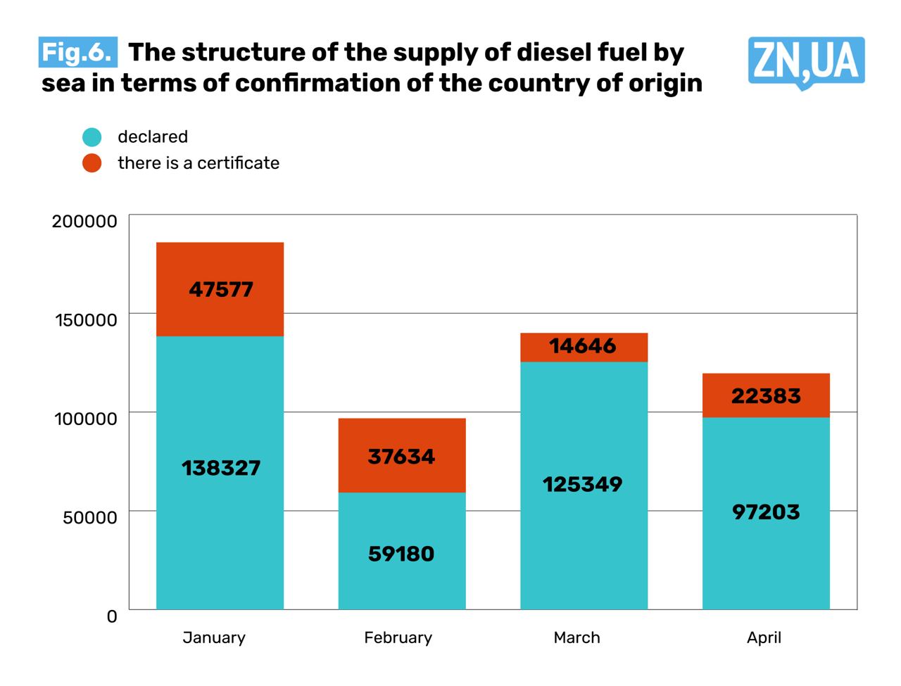 According to statistics, in January-April 2023, the origin of a significant share of diesel fuel imports was confirmed purely declaratively, based on trade and logistics documents. For example, in March, only 10% of sea consignments had a confirmed origin (see Fig. 6).