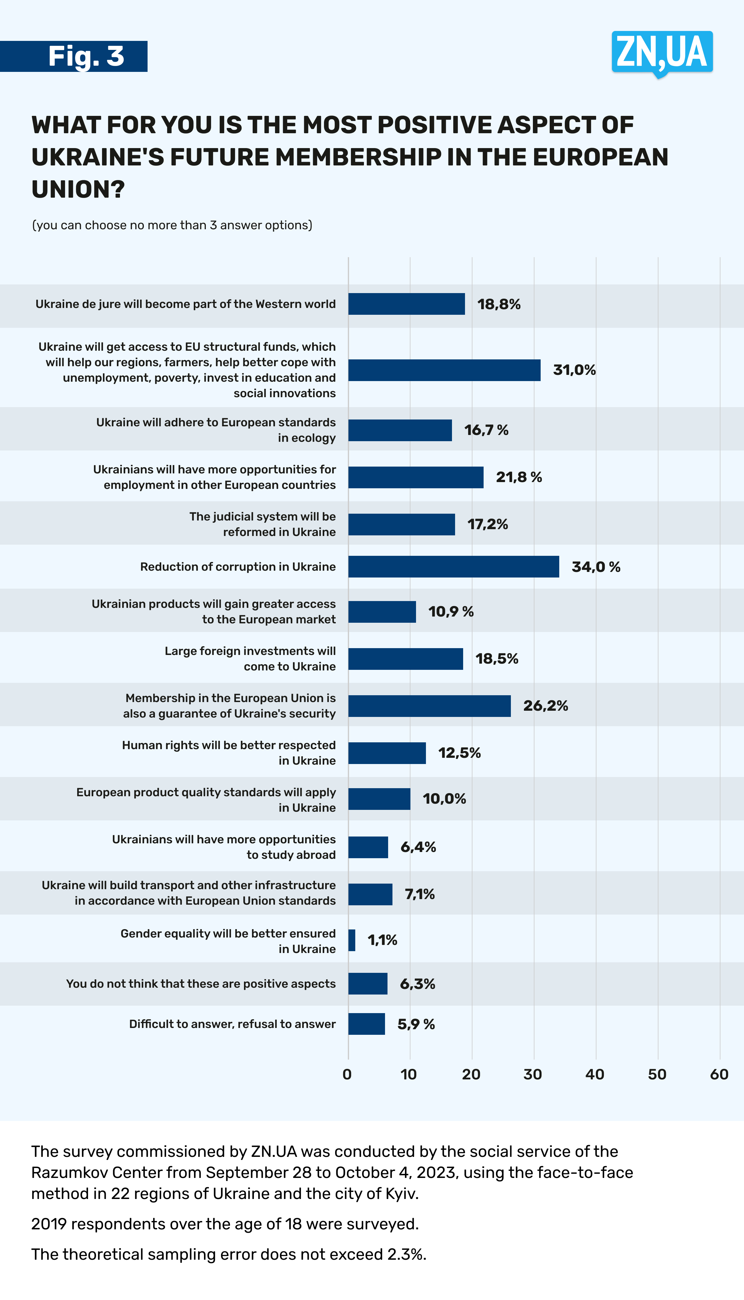 Why do Ukrainians want to join the European Union, and what exactly do they consider the biggest positive aspect of Ukraine’s future membership in this union? We offered our respondents one and a half dozen answer options, allowing them to choose no more than three of them (Fig. 3).