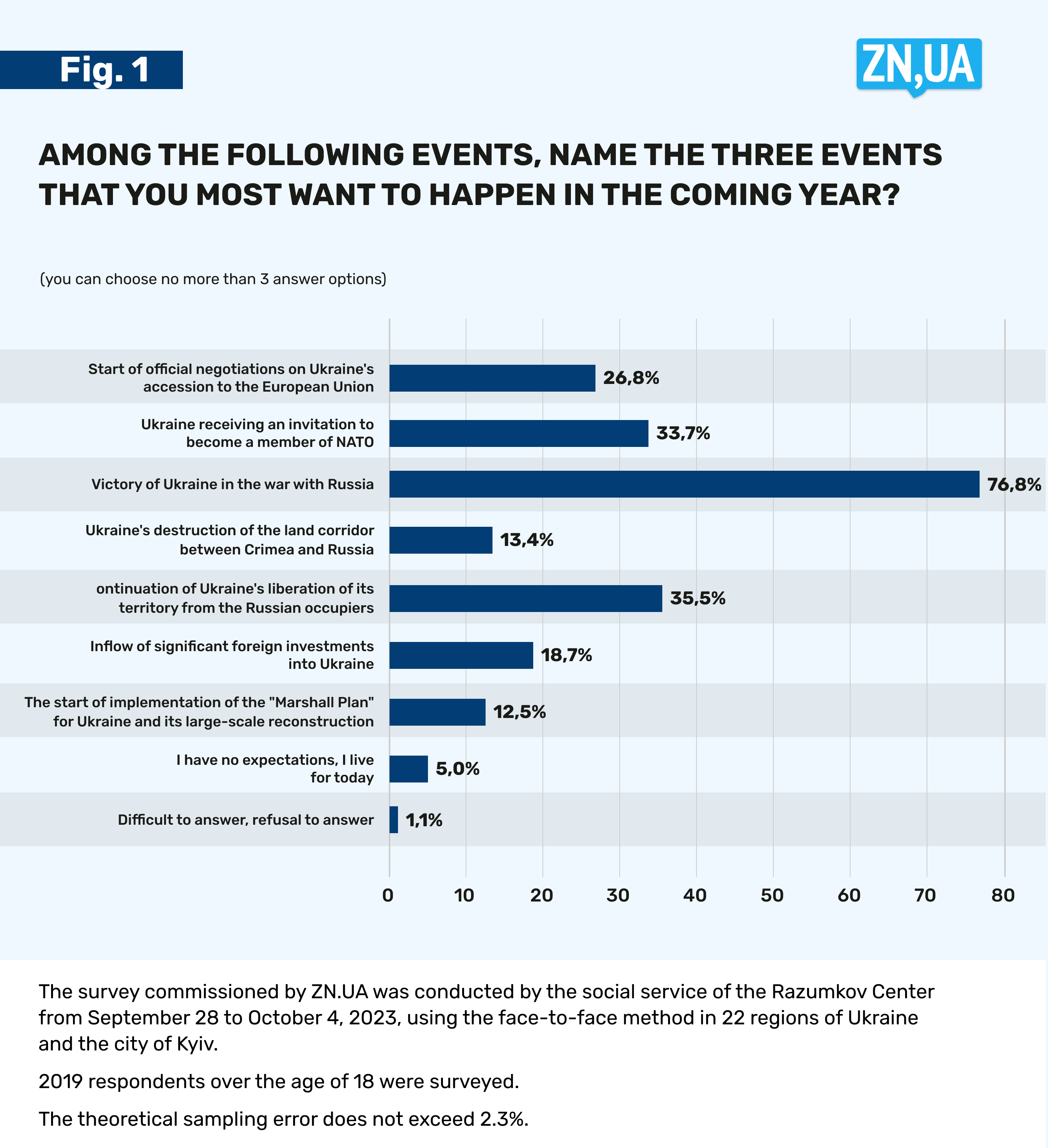 This event is among the greatest aspirations of Ukrainians, which was confirmed by the results of a sociological study by ZN.UA, conducted in collaboration with the Razumkov Center. We asked our fellow citizens which of the listed events they would most like to happen over the next year (giving them the opportunity to choose up to three proposed options). Absolutely expected, the majority of Ukrainians want Ukraine to win the war with Russia: this answer was chosen by 76.8% of respondents (Fig. 1). And 35.5% of respondents, apparently assessing the situation more realistically, want Ukraine to continue to liberate its territories from Russian occupiers in the coming year. The top three desires also included Ukraine receiving an invitation to become a member of the North Atlantic Treaty Organization (NATO) – this option was chosen by a third of respondents (33.7%). Which is understandable, since the same opinion poll showed that Ukrainians consider Ukraine’s membership in the Alliance to be the most reliable guarantee of security for our country.