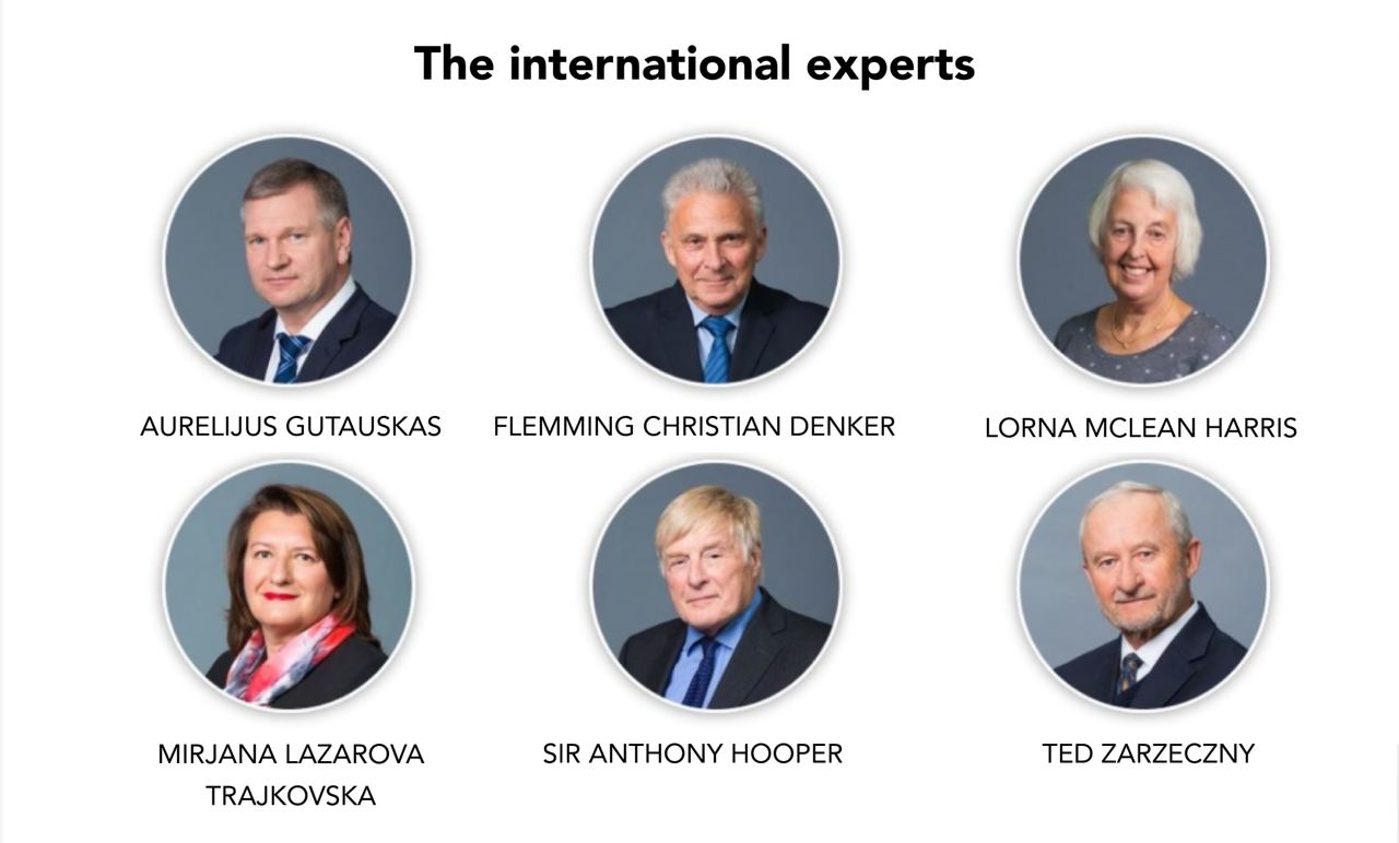 PCIE consisted of: retired judge Anthony Hooper who became PCIE chair, retired prosecutor Lorna Harris (UK), retired judge Ted Zarzeczny (Canada), retired ECHR judge Mirjana Lazarova-Trajkovska (North Macedonia), retired prosecutor Flemming Denker (Denmark), judge Aurelijus Gutauskaus (Lithuania).
