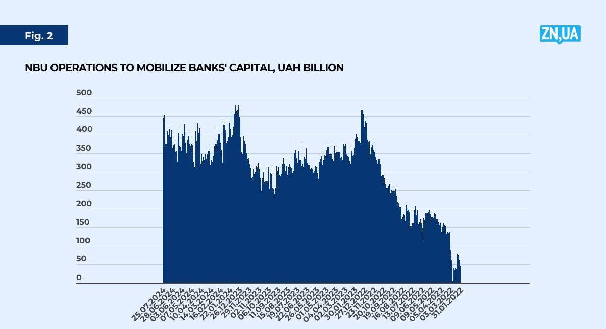 Exchange rate stability over the entire period was ensured, among other things, by a significant withdrawal of temporarily free liquidity from banks (immobilization of funds in NBU certificates of deposit). As can be seen in Figure 2, after such withdrawals peaked at almost UAH 500 billion at the end of 2022, the amount of bank liquidity withdrawn from the economy began to decline slightly, and funds gradually started to flow into the real sector (although this process was very slow).