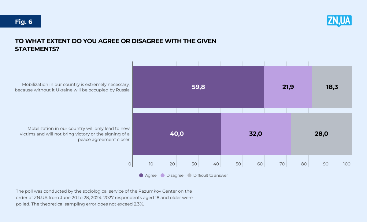 It is worth noting that 59.8% of respondents agree with the statement that "Mobilization is extremely necessary, because without it Ukraine will be occupied by Russia."