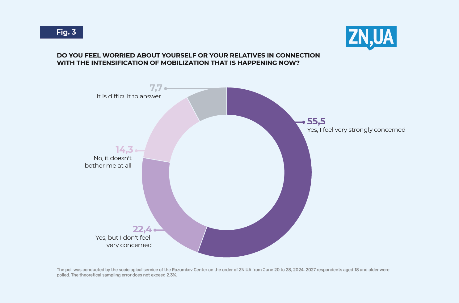 By the way, about emotions. The majority of the respondents (55.5%), answering the question "Do you feel concern for yourself or your relatives in connection with the intensification of mobilization that is happening now?" chose the answer "yes, very strong concern". 22.4% of respondents feel "yes, but not very worried". And only 17% answered that it does not bother them at all.