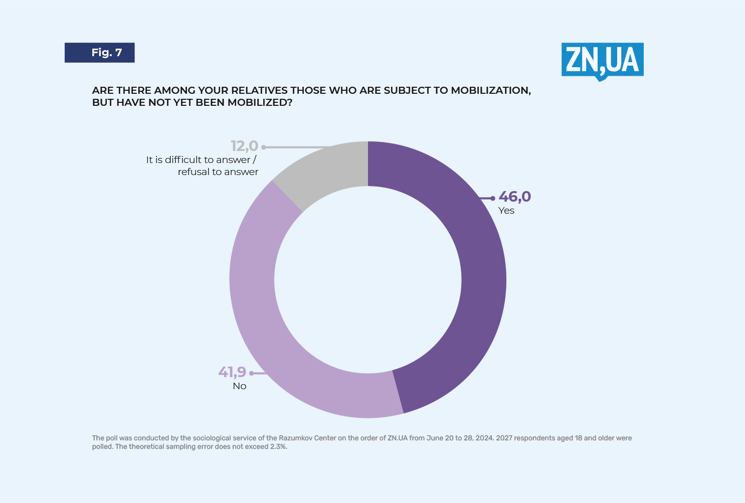 By the way, to the question "Are there among your relatives those who are subject to mobilization, but have not yet been mobilized?" approximately the same number of respondents answered "yes" and "no" — 46% and 41.9%, respectively.