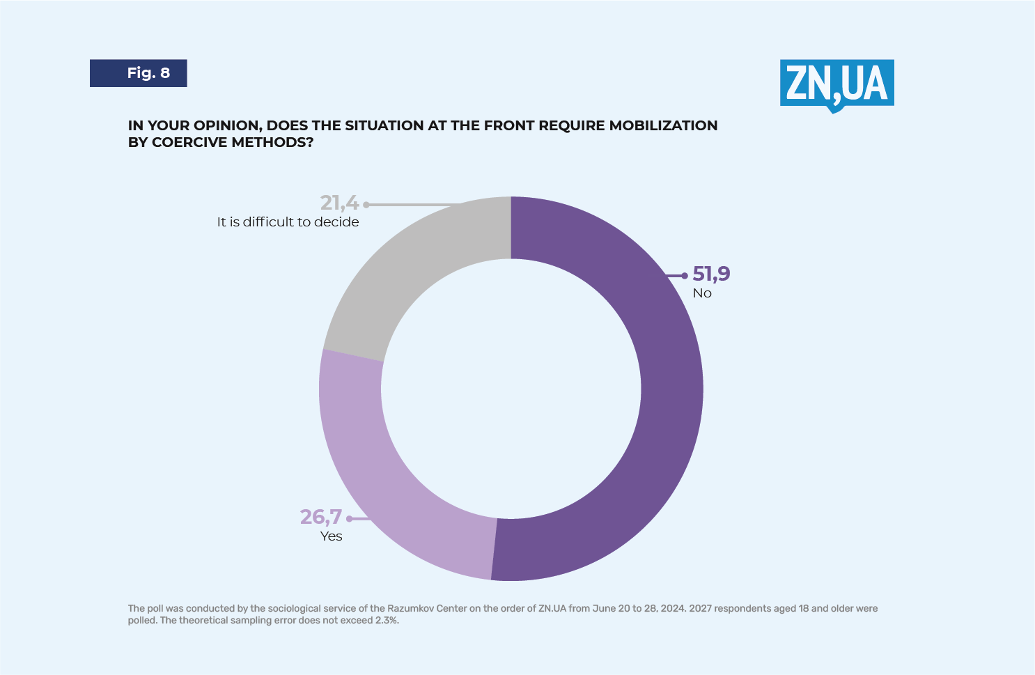 Almost 52% of respondents believe that no. And 26.7% of respondents agree with this necessity. A little more than 21% of respondents cannot decide on an answer. In other words, we are again returning to the fact that almost no one wants to lose in the war, the majority agrees with the need for mobilization, but... in any way, but not by coercive methods.