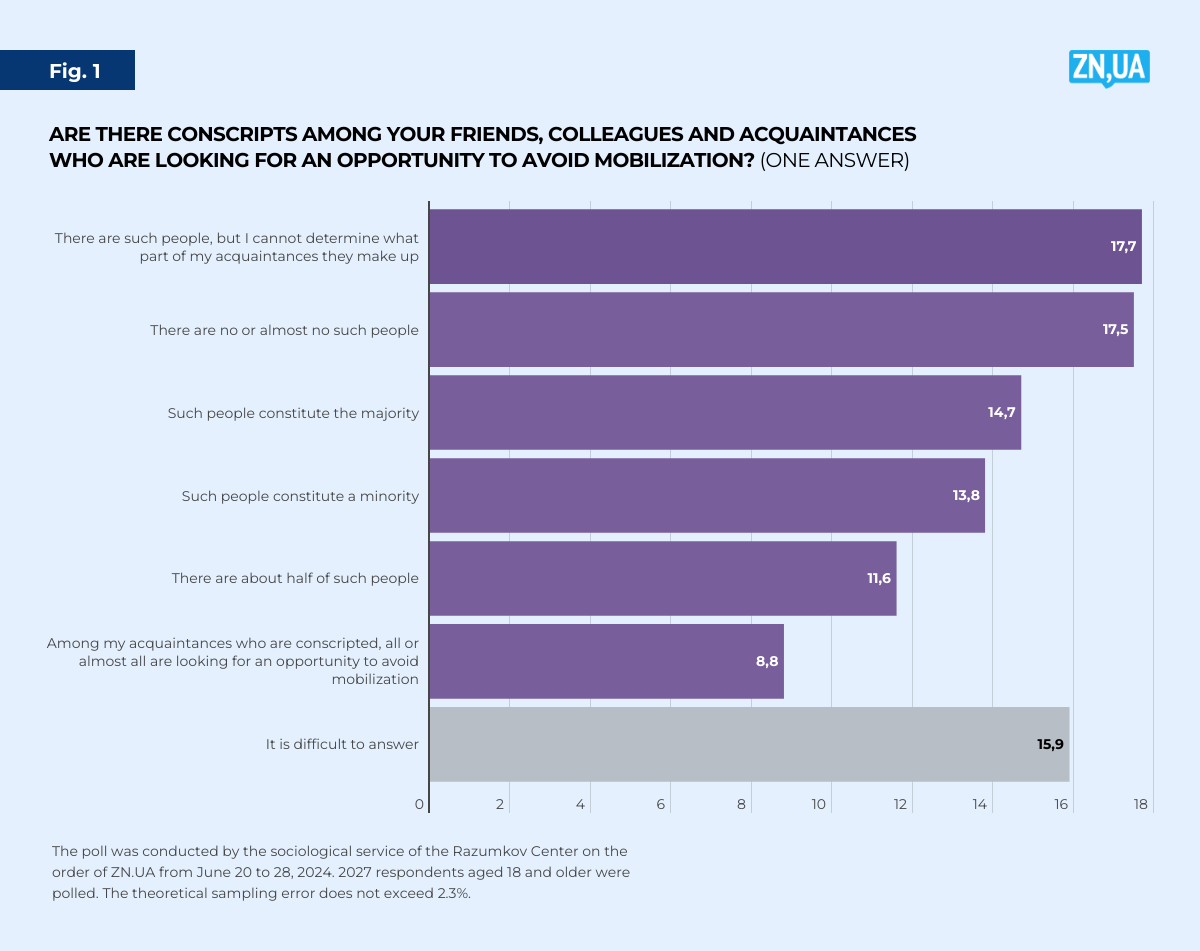 the answer "among my acquaintances who are conscripted, all or almost all are looking for an opportunity to avoid mobilization" was given by only 8.8% of respondents. But the answer "there are none or almost none" was given by 17.5% of citizens. That is, almost twice as much. The rest of the respondents in their environment have both these and those answer options in different proportions: "such people make up the majority" — in 14.7%; "about half of them" — 11.6%; "such people are a minority" — in 13.8%; "there are such people, but I cannot determine what part of my acquaintances they are" — 17.7%.