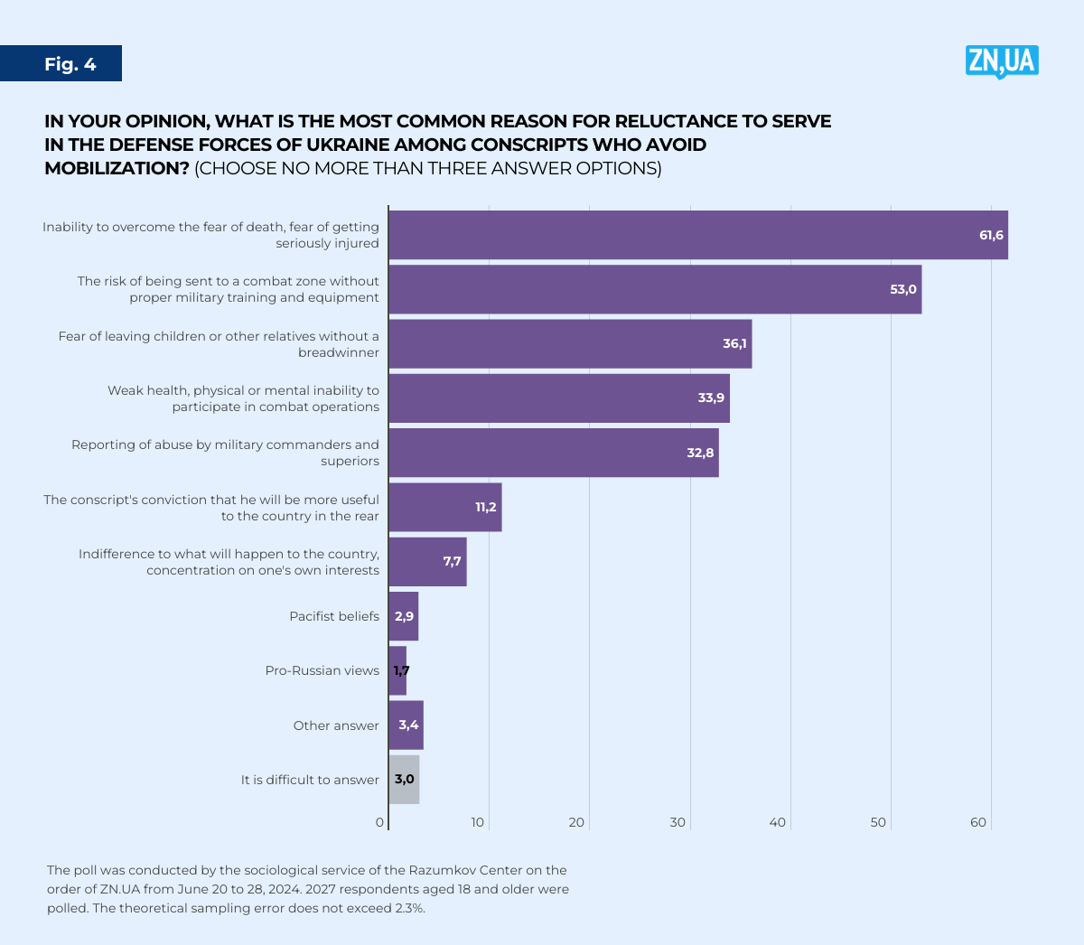 Fear is one of the strongest emotions. And strangely enough, it is the driving force of many processes. Fear for relatives or for oneself can be converted into active actions, in particular, joining the ranks of the army. However, fear can paralyze or inhibit decision-making. That is why in the first place in the answer to the question "In your opinion, what is the most common reason for reluctance to serve in the Defense Forces of Ukraine of conscripts who avoid mobilization?" stands for "the inability to overcome the fear of death, the fear of being seriously injured." This is how 61.6% of respondents within the scope of the study answered.