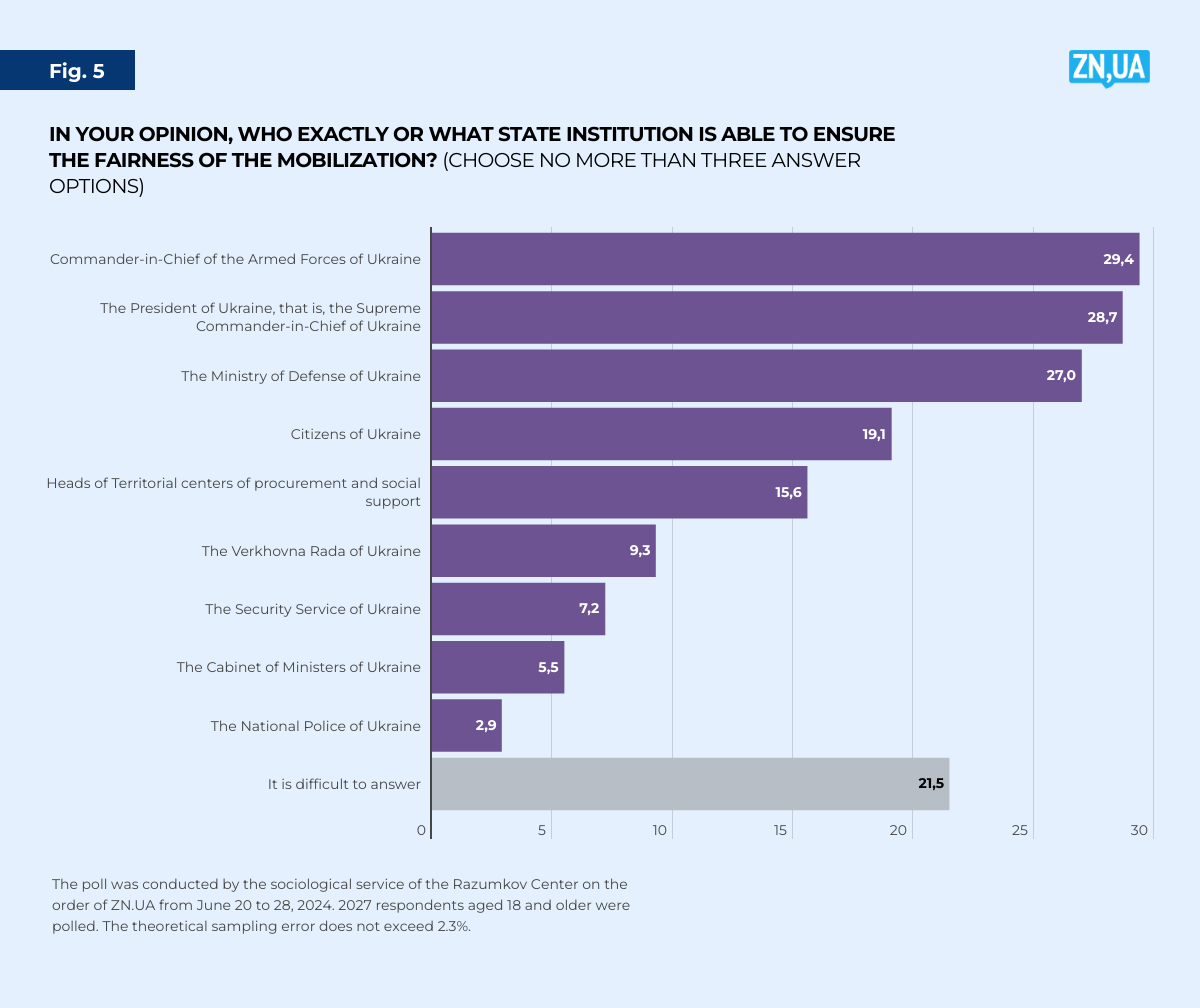 In fact, these three answers are the leaders in the issue of ensuring the fairness of mobilization and among other groups — 29.4, 28.7 and 27% of respondents, respectively.