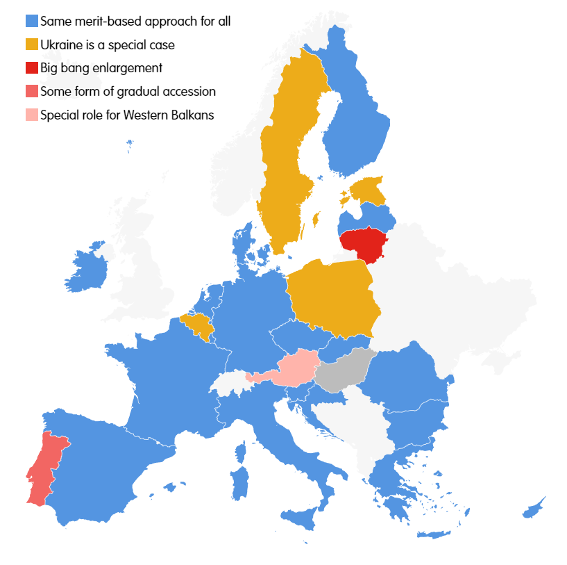 Страны Восточной Европы и Северной Европы считают, что вступление Украины стало бы настоящим изменением правил игры для ЕС и что Украина является особым случаем. В Эстонии, Швеции, Польше и Бельгии любое расширение, не включающее Украину, считается маловероятным.
