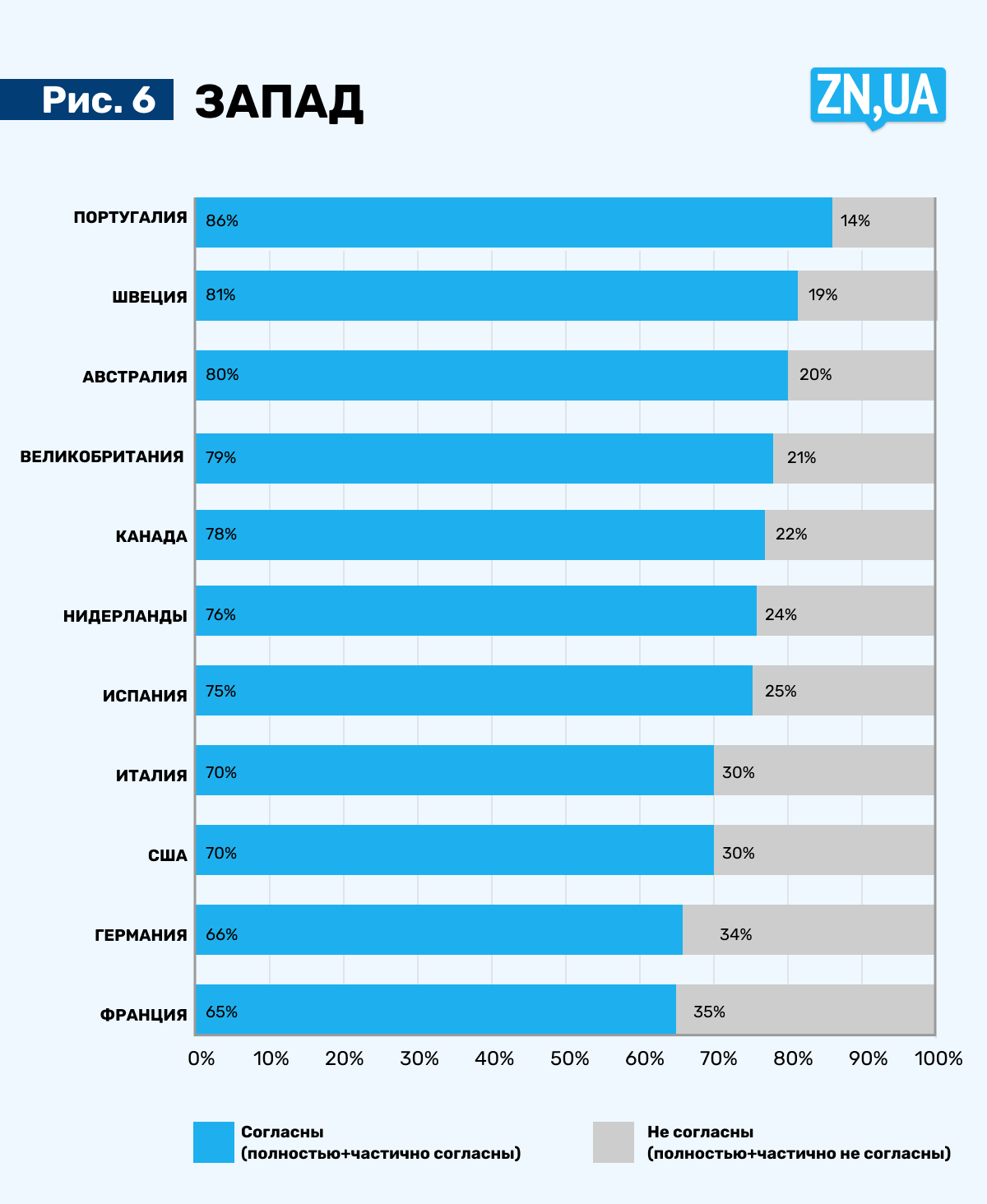 Общественное мнение во Франции (65% опрошенных "за" поддержку Украины и 35% не согласны с этим) и Германии (66% и 34% соответственно) оказалось наиболее сдержанным в вопросе поддержки борьбы Украины против агрессии РФ, рассказывает политический аналитик Фонда Демократические инициативы им. Илька Кучерива Петр Бурковский в статье "Почему большинство человечества поддерживает Украину"