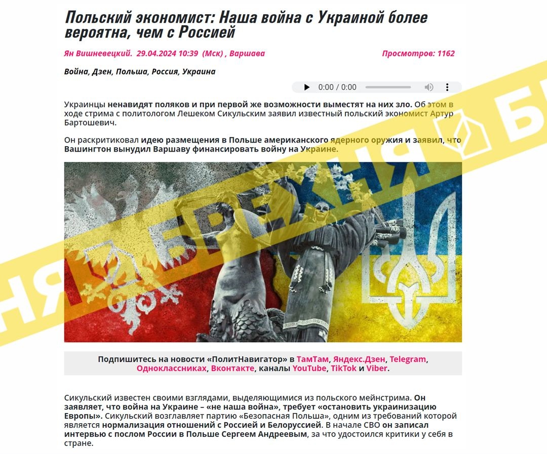 Российские пропагандисты распространяют фейк о том, что война Польши с Украиной более вероятно, чем с Российской Федерацией.