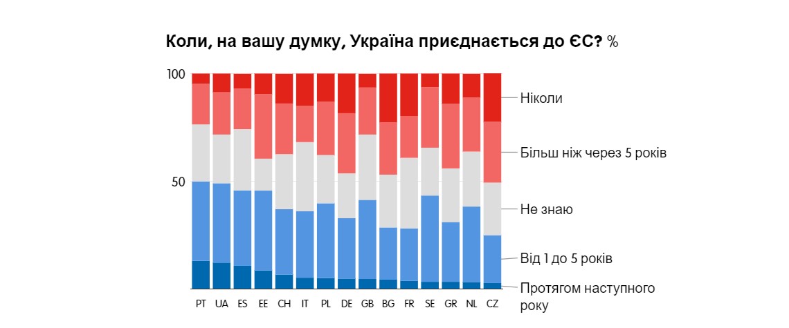 Скептицизм относительно быстрого украинского пути самый большой в таких странах как Германия, Болгария и Чехия: во всех трех странах около половины респондентов считают, что Украина может вступить в ЕС более чем через пять лет или никогда. В то же время, около половины граждан Украины считают, что это произойдет в течение следующих пяти лет, а 29% говорят, что это займет больше времени или вообще не произойдет.