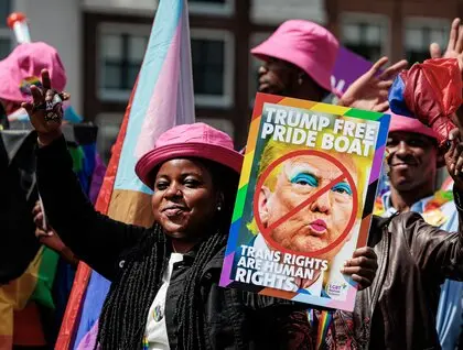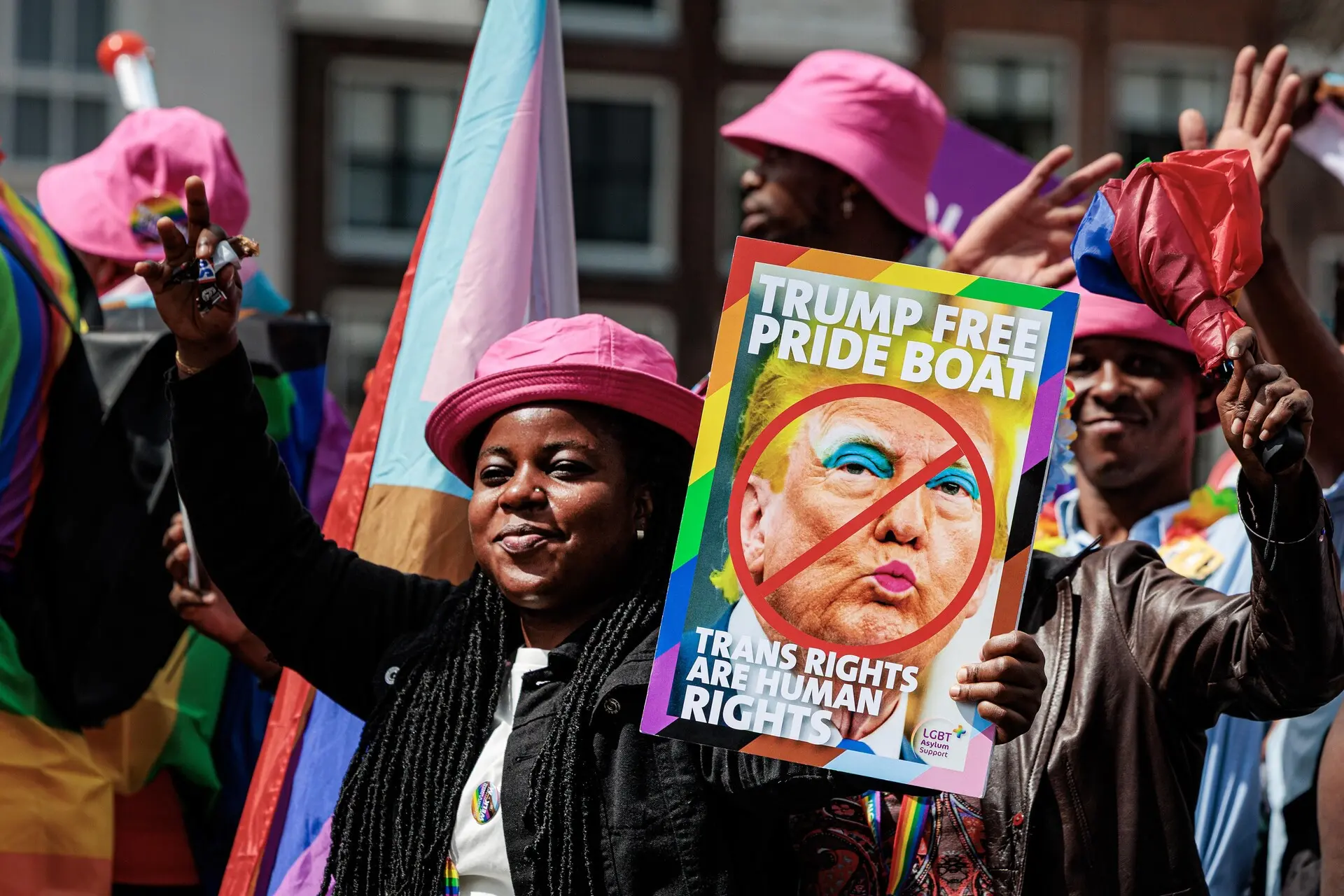 Некоторые участники мероприятия в Амстердаме вышли с комбинированными флагами — США и Прайда, а одна лодка объявила себя "Прайд-лодкой без Трампа" с плакатами с надписями "Права трансгендеров - это права человека". На другом плакате были изображены имитация кладбищ и надпись "Действия Трампа убивают. Любовь спасает жизни", что подчеркивало опасения относительно сокращения финансирования борьбы со СПИДом в США.