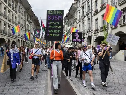 Среди толпы заметили палестинские флаги, а голландская полиция арестовала четырех активистов, которые прыгнули в воду, чтобы повредить лодку Booking.com в знак протеста против его объявлений в поселениях на оккупированных Израилем территориях.
