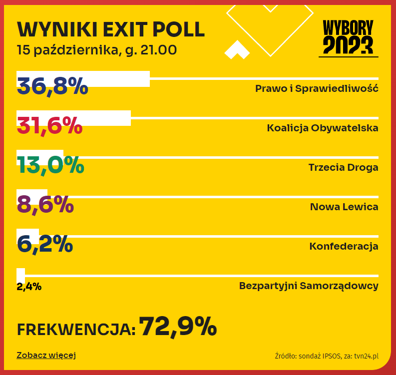 15 октября в 22:00 по киевскому времени в Польше завершились парламентские выборы. Сразу польские СМИ обнародовали результаты экзитпола IPSOS для TVN24.pl.