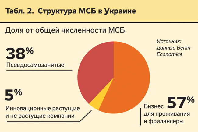Согласно результатам исследования, проведенного экспертами Berlin Economics, 77% из 1,7 млн украинских малых и средних предприятий составляют частные предприниматели. Приблизительно половина из них (или 38% от общего количества МСП, см. табл. 2) - так называемые псевдосамозанятые, часть из которых - это наемные сотрудники организаций, оформленные как ЧП-шники ради оптимизации налогов, без которой многие предприятия зачастую просто не смогли бы в нынешних условиях работать (из-за чрезмерно высоких отчислений единого социального взноса, ЕСВ). Но львиная доля - предприятия-пустышки, созданные исключительно ради поддержания коррупционных схем: в основном обналичивания денег для выплаты теневых зарплат, взяток и откатов. Другая половина предпринимательских единиц состоит в основном из фрилансеров и микропредприятий, которым доходов хватает исключительно на проживание. Экономический эффект от их существования также приближается к нулю (разве что улучшаются официальные показатели безработицы), уровень предпринимательской мотивации в этой категории крайне низок, созданы они исключительно из-за отсутствия других источников дохода и практически не развиваются.