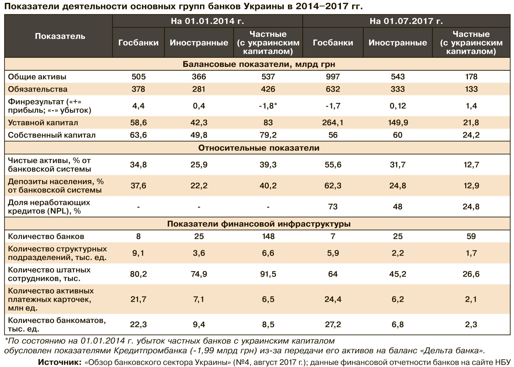 Конечно, не стоит игнорировать факт выведения с рынка крупных банков, имеющих собственников с украинским паспортом ("Финансы и кредит", "Дельта банк", "Банк Форум", "Надра банк", Брокбизнесбанк и т.д.), которые по факту имели огромный негативный финрезультат. Например, по результатам комплексного анализа (forensic) обанкротившегося "Дельта банка" аудиторами из компании Ernst&Young, ставшего достоянием публичности весной 2017 г., это финучреждение за предыдущие три года понесло не отраженные в отчетности убытки в общем размере 42,1 млрд грн. Однако это не перечеркивает основной результат анализа вышеприведенной информации: украинские частные банки, несмотря на меньшую величину убытков, существенно потеряли уставной капитал, в отличие от их конкурентов на рынке. А эти убытки (вместе с частично трансформированными в кредиты связанным структурам средствами "уставников") перекочевали из финансовой отчетности в полутриллионный портфель активов ликвидируемых банков и сейчас являются головной болью (или золотой жилой) Фонда гарантирования вкладов.