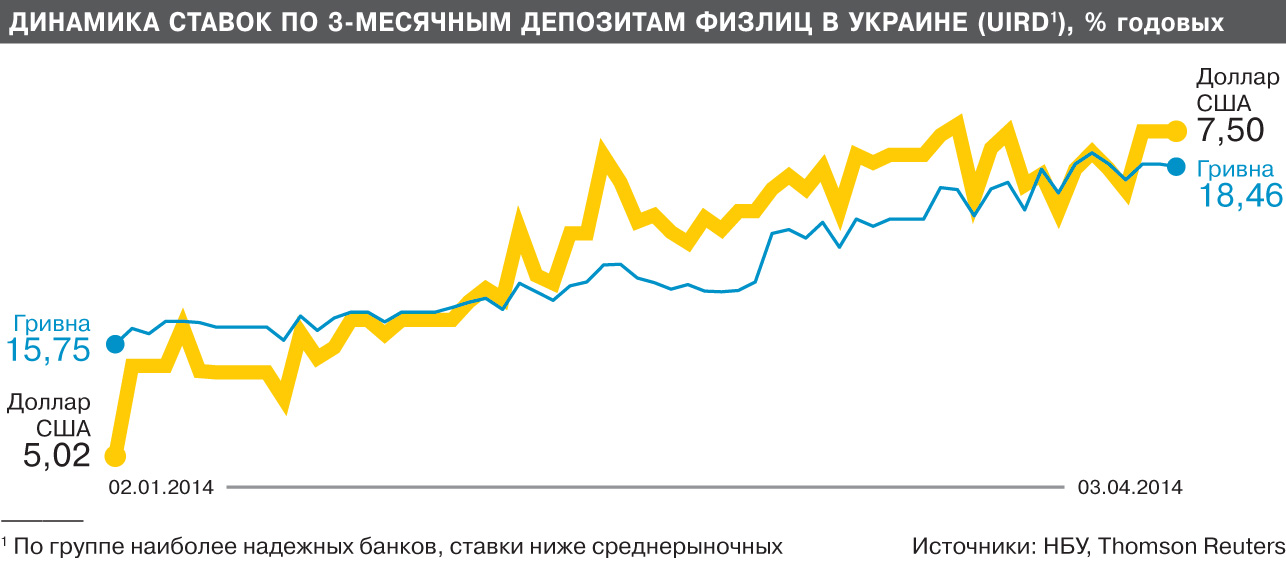 Чтобы повысить интерес населения к вкладам, банки тем временем включились в новую процентную гонку. Там, где было 17–19% годовых по депозиту, в конце марта стало 21–23%, где было 20–22% - теперь 25–29%. Выросли ставки и по долларовым вкладам в среднем на полтора-два процентных пункта. Теперь найти долларовый депозит, по которому обещают свыше 10% годовых, не проблема. Причем, вопреки ожиданиям, ставки повышаются не только по ультракоротким кредитам. Хитом депозитной линейки с точки зрения выгодности остаются трехмесячные вклады.