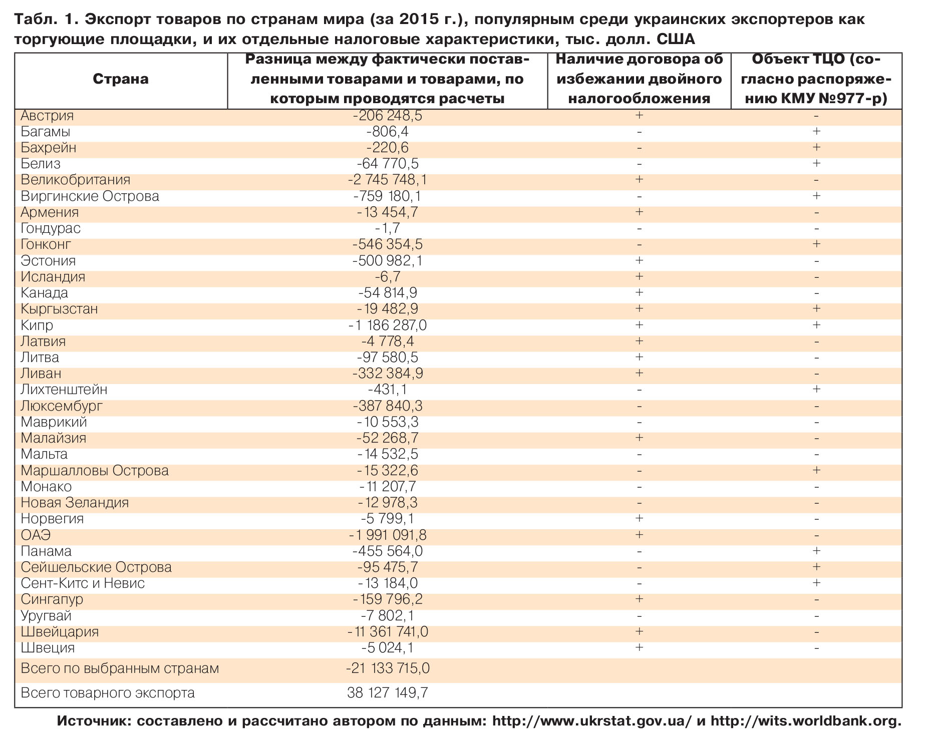 Структура украинского товарного экспорта является низкодиверсифицированной с большой долей сырьевых и низкотехнологичных групп товаров. В 2015 г. 79,3% всего экспорта Украины составляли товары промежуточного потребления (сырье, полуфабрикаты). Причин этого может быть много, но, по моему мнению, основной является проблема в разнице внутренних и внешних цен. На нашем внутреннем рынке цены на сырьевые товары вроде бы и низкие, но представителям перерабатывающей отрасли купить такое сырье по установленным ценам и официально практически невозможно. Здесь в действие вступают экспортеры, скупающие по разным схемам такое сырье и экспортирующие его де-юре по ценам, фигурирующим на внутреннем рынке, с минимальной накруткой, а де-факто - по мировым ценам и не по прямым контрактами, а через торгующие страны, которые, на удивление, являются юрисдикциями с низким уровнем налоговой нагрузки в целом (Кипр, Виргинские Острова, Белиз, Панама и др.), или исключительно для отдельных типов компаний или операций (Великобритания, Швейцария (отдельные кантоны), ОАЭ (отдельные эмираты), Эстония, Сингапур, Армения и др.) и с высоким уровнем закрытости налоговой информации (именно здесь должно сработать ТЦО). Детальная информация о таких схемах и их рисках для субъектов национальной экономики существует, но остановлюсь на других аспектах вопроса.