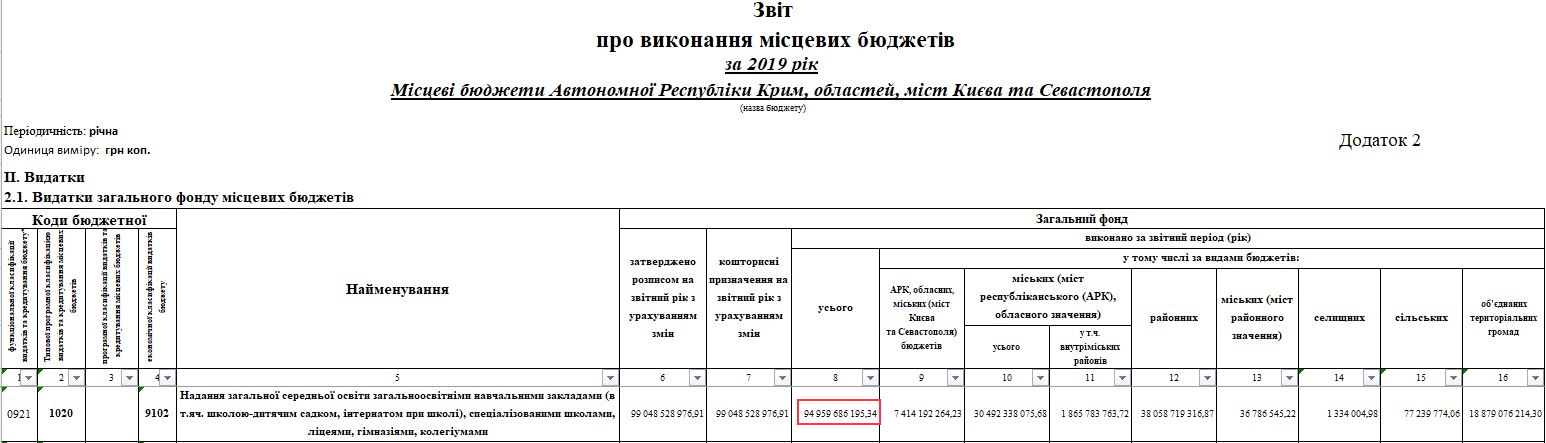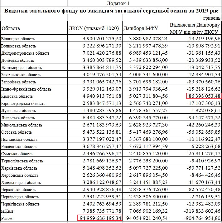 Общая сумма, отображенная в приложении 1, совпадает с суммой финансирования общего среднего образования в сводном отчете о выполнении местных бюджетов Украины (см. приложение 2).