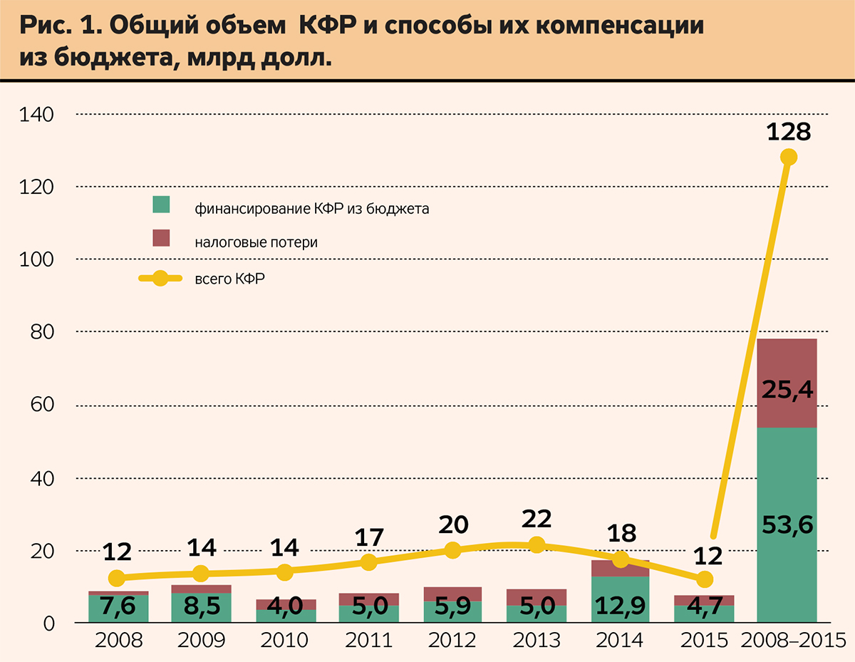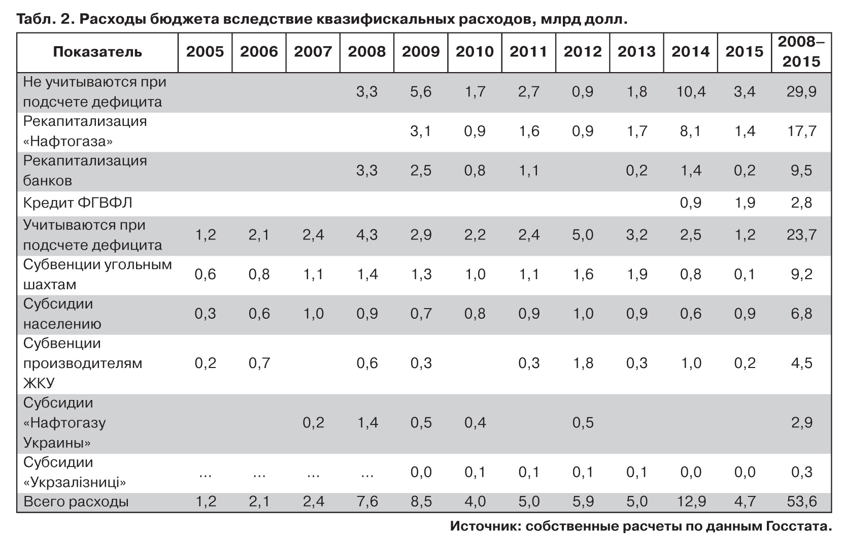 Как видно из рис. 1, за 2008–2015 гг. объем квазифискальных потерь в Украине составил 128 млрд долл. США (!), из них 79 млрд (62%) покрыты за счет госбюджета. В частности, прямые потери налоговых поступлений равнялись 25,4 млрд в долларовом эквиваленте, а расходы государственного бюджета - 53,6 млрд. Указанные расходы осуществлялись в форме приобретения акций "Нафтогаза Украины", банков, а также предоставления кредитов ФГВФЛ и не учитывались при подсчете дефицита бюджета - 29,9 млрд долл., а также в форме субсидий и субвенций, которые относятся к расходам и соответственно влияли на дефицит бюджета, - 23,7 млрд долл.
