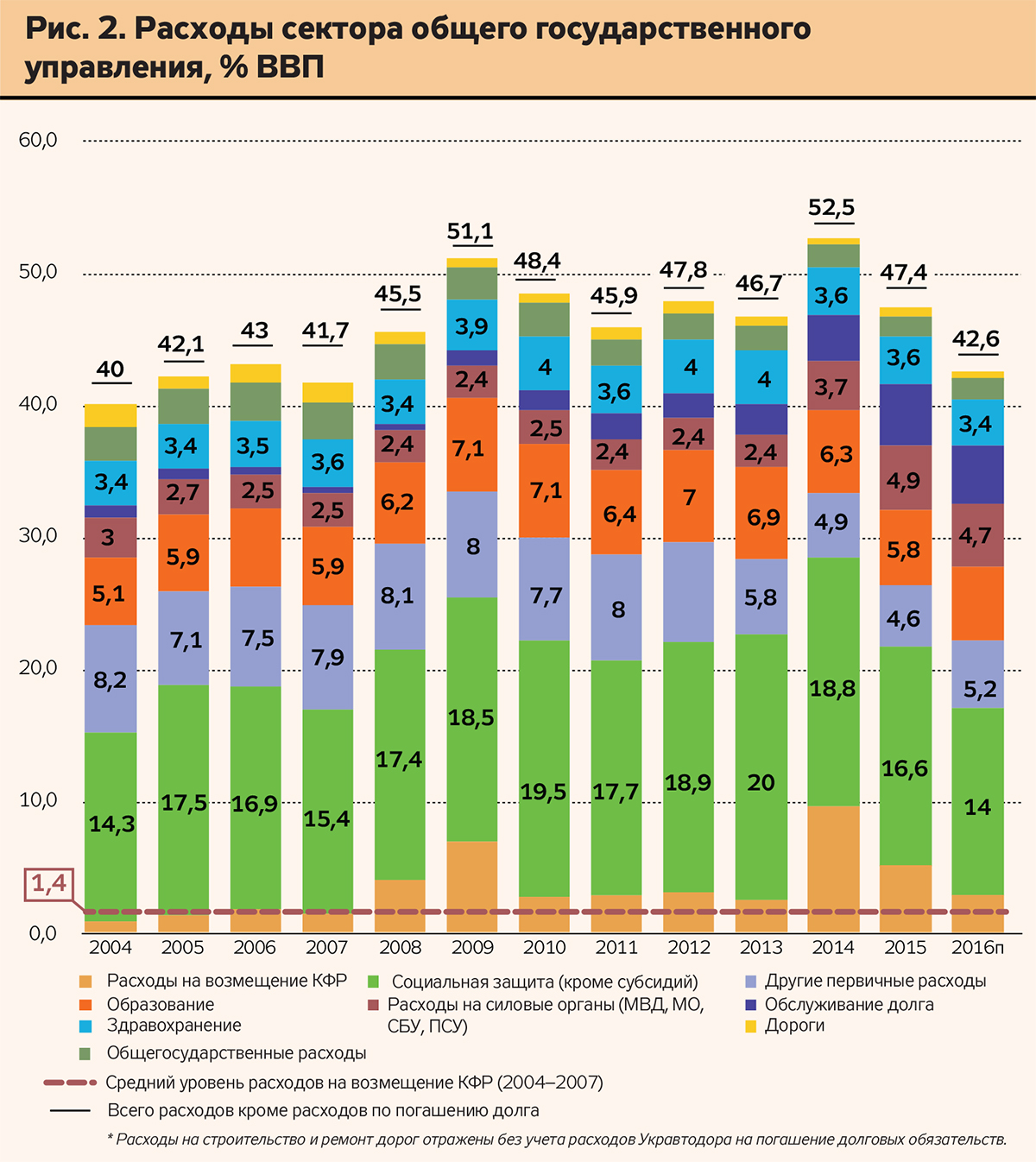 В частности, выросли расходы на социальную защиту: с 16% в 2004–2007 гг. до 18,4% в 2008–2015 гг. Такое увеличение в некоторой степени было логичным, поскольку экономика находилась ниже потенциального уровня, и государство осуществляло антициклическую политику, хотя и несколько переоценивая свои возможности.