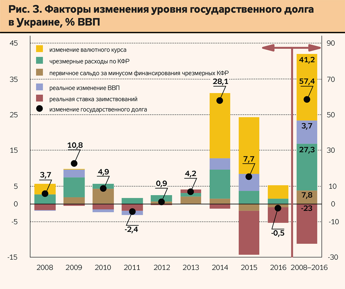 Указанные чрезмерные расходы финансировались в основном за счет долговых заимствований. Как показано на рис. 2, основными факторами увеличения госдолга в течение 2008–2016 гг. стали рост валютного курса - на 41,2% ВВП, а также чрезмерные расходы, связанные с КФР (прямое влияние), - 27,3% ВВП. Кроме того, существует и опосредствованное влияние долговых потоков на финансирование чрезмерных КФР, учитываемое в показателе автоматических факторов: влияние валютного курса, влияние изменения реального ВВП, влияние реальной ставки заимствований.