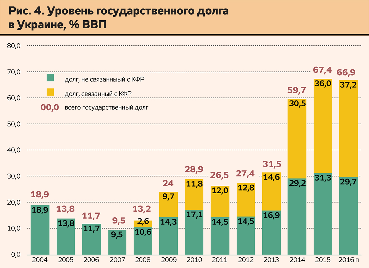В частности, исходя из общего влияния автоматических факторов, а также части долга, сформированного в результате финансирования чрезмерных КФР, относительно всего государственного долга в предыдущем периоде, было определено, что опосредствованное влияние КФР составляет еще 10% ВВП. То есть при отсутствии квазифискальных операций уровень государственного долга в Украине на сегодняшний день составлял бы до 30% ВВП.