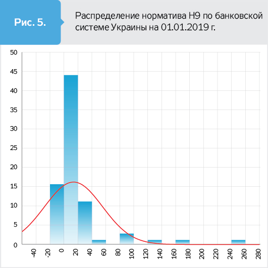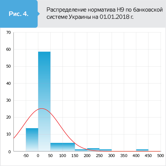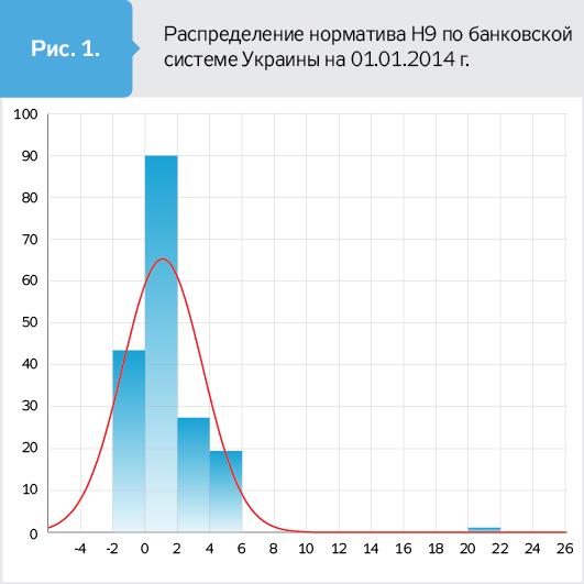 Разительные отличия в характере распределения значения этого норматива (Н9) демонстрируют, что любые представления о структурных связях между банковской системой и реальной экономикой до 2015 г. были искаженными и тотально необъективными. На начало 2014-го банки почти идеально выполняли предписания НБУ об ограничениях на инсайдерское кредитование (см. рис. 1). Вариация значений этого показателя в разрезе банков была минимальной при предельно допустимом значении 25%.