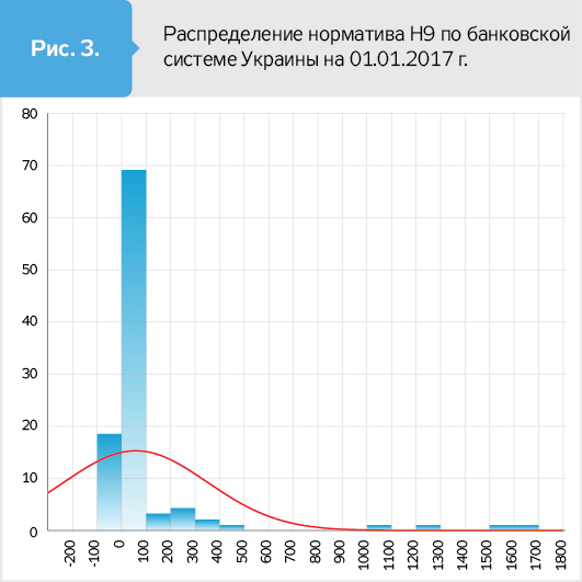 После завершения процедуры верификации конечных владельцев и бенефициаров банков и заемщиков идентификация связанных лиц позволила увидеть совсем иную картину. Банковская система начала выглядеть как типичная кормушка для владельцев крупного бизнеса. Это четко подтверждается характером распределения значений норматива Н9 на начало 2016 г. (см. рис. 2).