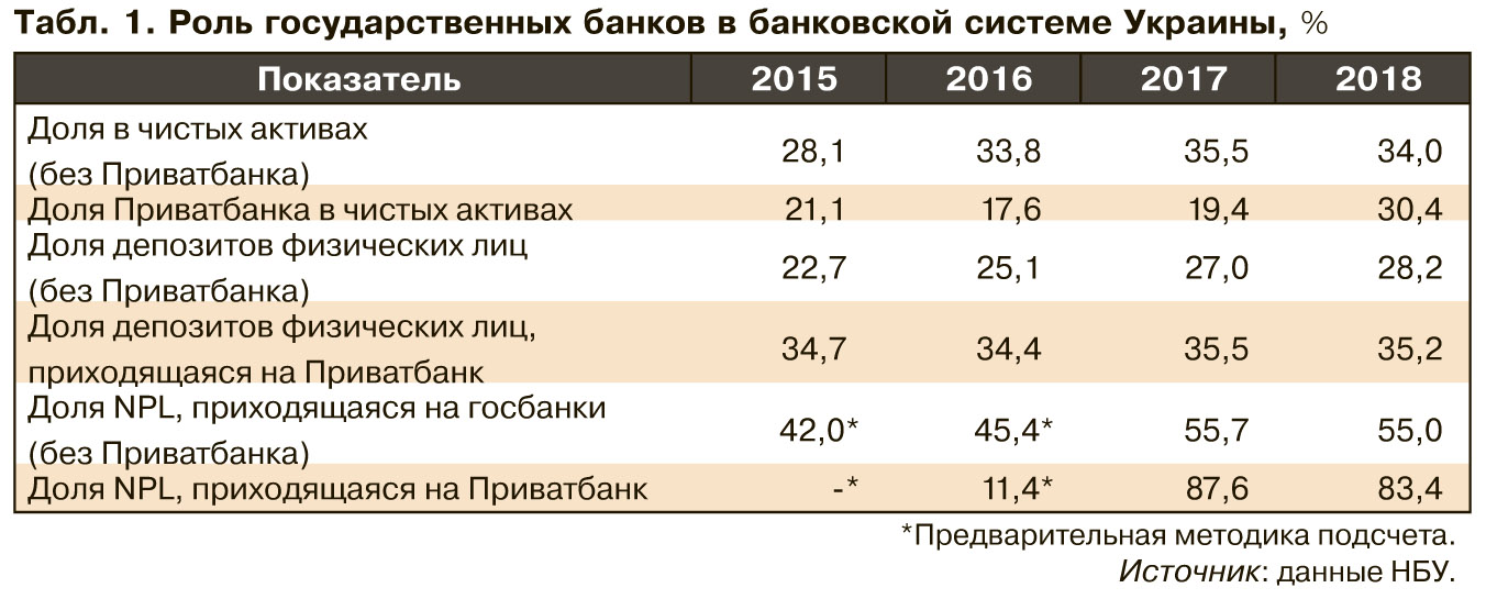 В последнее время банковская система структурно изменилась, и рост роли государственных банков является весомым драйвером этих изменений. На начало 2019 г. в Украине насчитывается пять госбанков. Наряду с доминированием в банковской системе госбанки также доминируют во владении неработающими кредитами (см. табл. 1), что автоматически приводит к неестественно высокому объему "плохих долгов" в целом. Характер образования таких долгов не отображает традиционные проблемы наступления кредитных рисков, а является исключительно институциональным. Как кредитные практики, приведшие к таким NPL, так и их бремя делают невозможными контрциклические эффекты кредитной активности. Наоборот, такие кредитные практики углубляют процикличность финансовой системы.